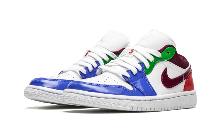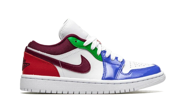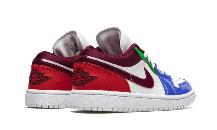 The Women's Air Jordan 1 Low SE "White/Multicolor" mixes colors and materials on Michael Jordan's first signature shoe in the desirable low-top silhouette. Fitted in women's sizing, the aptly named "White/Multicolor" indeed joins different shades of color together for a unique look in and of itself. The perforated toe and mid-panel display a smooth variety of white leather while the forefoot and toe cap are composed of a glossy blue patent leather material. The varied look of the shoe continues on the green leather eyelets and again on the Beetroot shade of maroon used on the padded collar and leather Swoosh on either side. A black embroidered "Wings" emblem appears on the fiery shade of red leather on the back of the shoe. Tonal Jumpman detailing can be found on the white nylon tongue. Red "23" branding on the lace overlay adds a subtle pop of color to the top of the Women's Jordan 1 Low in the "White/Multicolor" design.