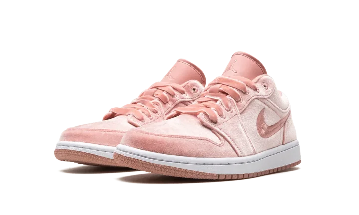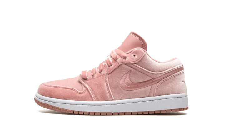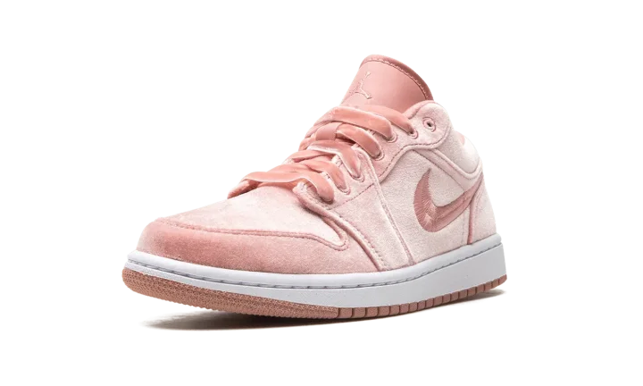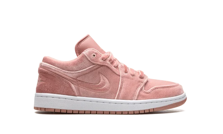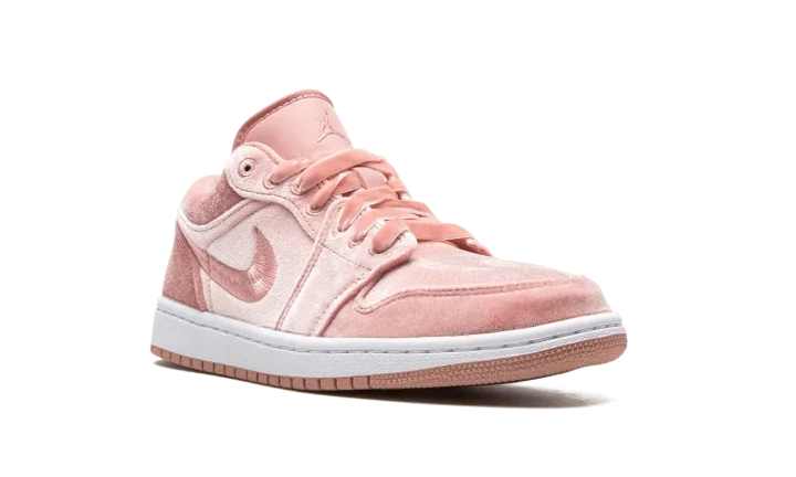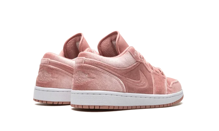 The Women's Air Jordan 1 Low SE "Pink Velvet" is a women's-exclusive colorway of the low-top sneaker made from plush velvet. The colorway features a Rust Pink suede construction with tonal embroidered Swoosh branding on the sides and a tonal embroidered "Wings" logo on the heel. A pink Jumpman is stitched onto the pink nylon tongue. The shoe's monochromatic pink upper is contrasted with a white rubber midsole and gum rubber outsole. Release date: December 1, 2022
