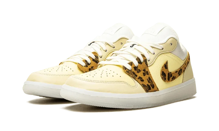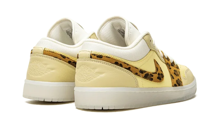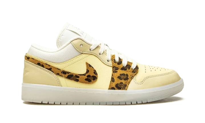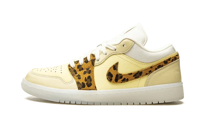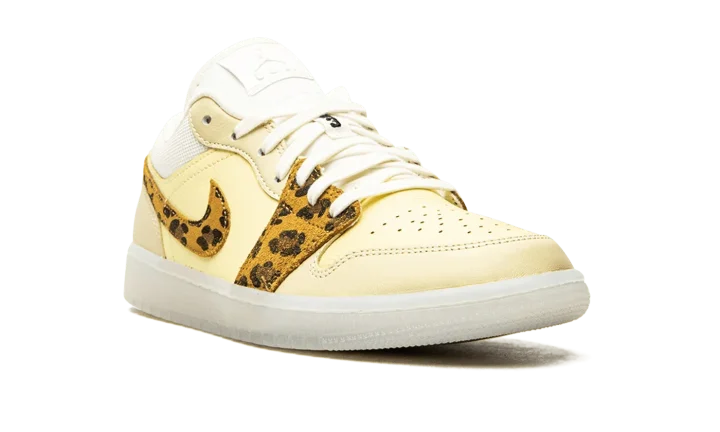 The Women's Air Jordan 1 Low "SNKRS Day" is an August 2021 release of the women's version of the vintage basketball shoe that shows appreciation for the fourth anniversary of Nike SNKRS app in Europe. This exploratory look for Michael Jordan's first signature shoe features leopard print on the forefoot and Swoosh. The base is arranged in a combination of cream and yellow leather panels. A tonal ball-and-wings logo appears on the heel and a white debossed Jumpman with "Air" branding highlights the look of the white leather tongue tag. Black "23" detailing on the lace overlay completes the look. Release date: August 8, 2021