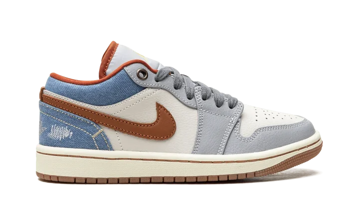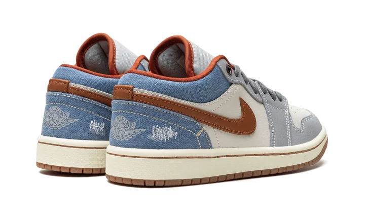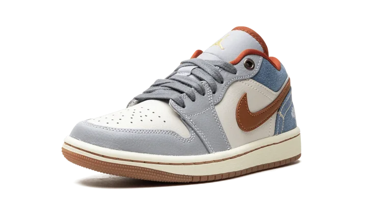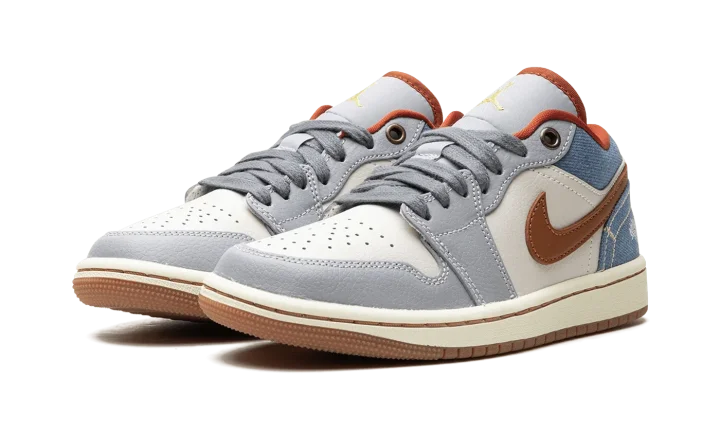 The Women's Air Jordan 1 Low "Phantom Denim" is a women's-exclusive colorway of the retro basketball shoe in a colorway with multiple fabrics. The upper features a white leather base, with grey leather overlays on the toe, forefoot, and eyelets. A brown leather Swoosh appears on both sides of the shoe. A durable denim fabric is found on the collar and heel. A classic "Wings" logo is printed on the heel, while a white contrast stitching appears on either side of the heel. A Sail rubber midsole and brown rubber outsole complete the look. Release date: February 16, 2024