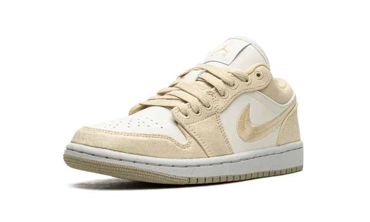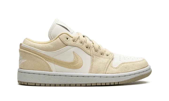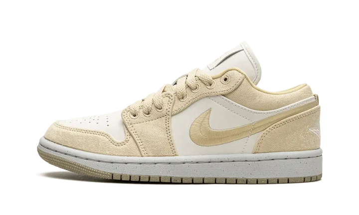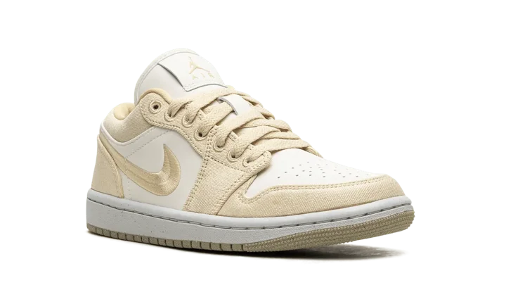 The Women's Air Jordan 1 Low SE "Team Gold" is a women's-exclusive colorway of the retro basketball shoe with a premium build featuring canvas. The colorway includes a white leather base with Team Gold canvas overlays and a Team Gold woven Swoosh. A white "Wings" logo is embroidered on the heel of the shoe. More Team Gold accenting includes Jumpman and "Air" logos on the tongue tag. A white rubber midsole and gold outsole complete the clean look.