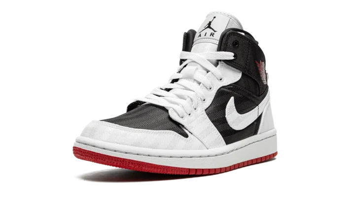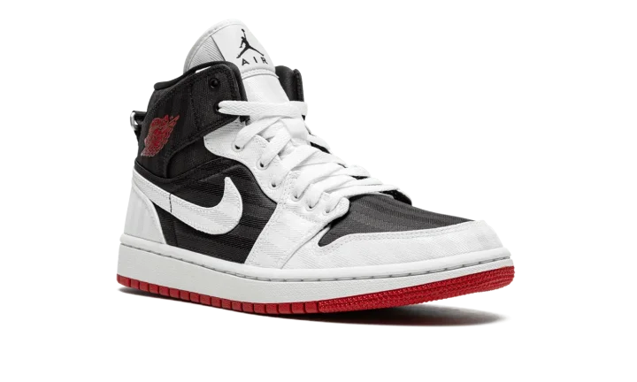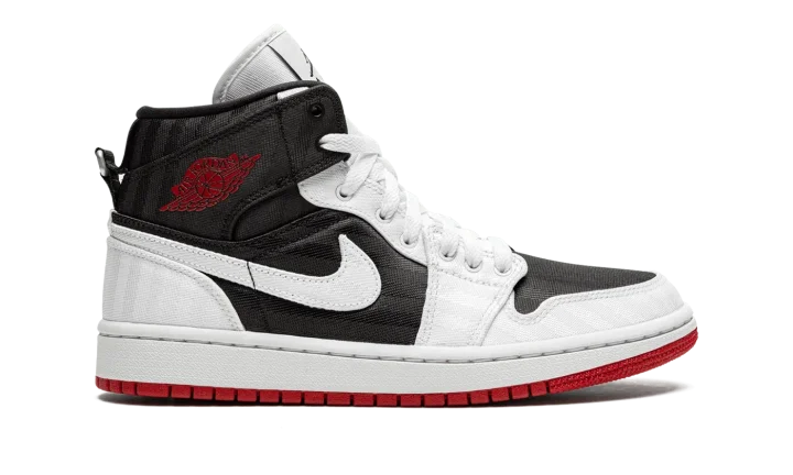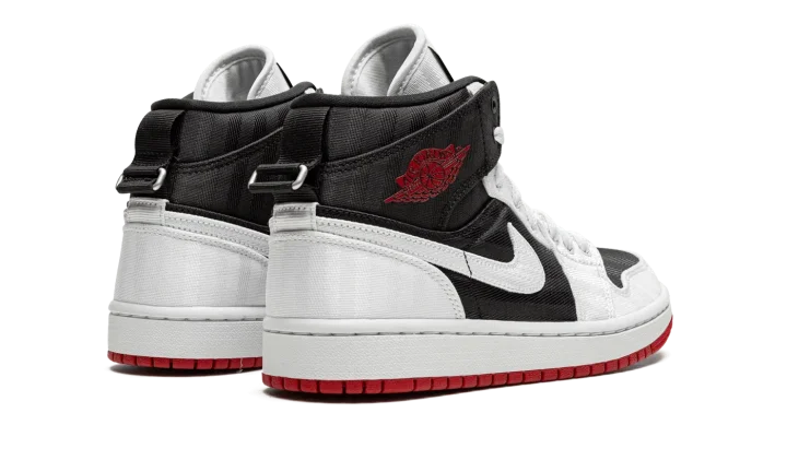 The Women's Air Jordan 1 Mid SE Utility "White/Black/Gym Red" is a women's version of Michael Jordan's retro basketball shoe in a Chicago Bulls-friendly colorway. This modified look for the popular mid-top silhouette by Jordan Brand features the black, white, and red team uniform colors of Jordan's former team, the Bulls. The shoe has a protective canvas upper featuring a white black base with contrasting white overlays and Swoosh branding. A red "Wings" logo appears on the collar and black Jumpman and "Air' detailing is found on the white nylon tongue tag on the white nylon tongue. An added "D" ring appears on the back of the black nylon strap on the heel.