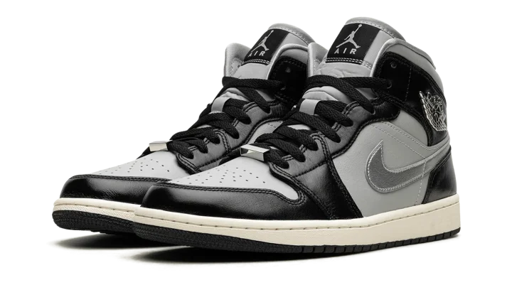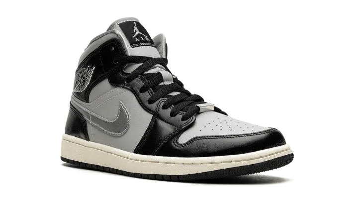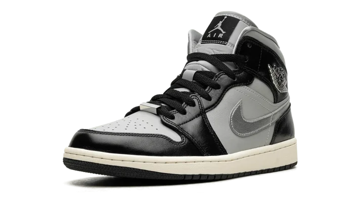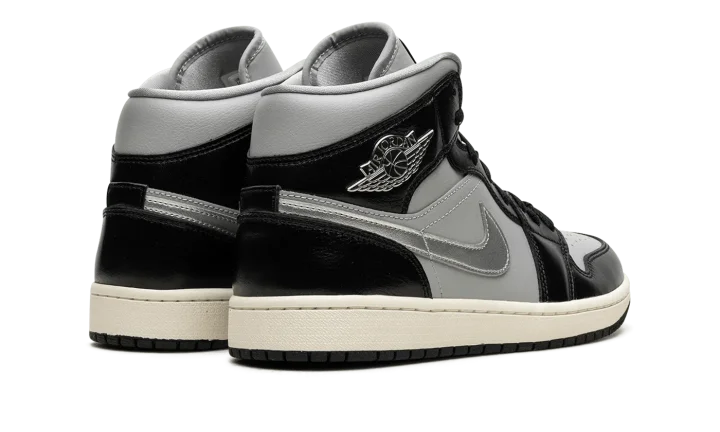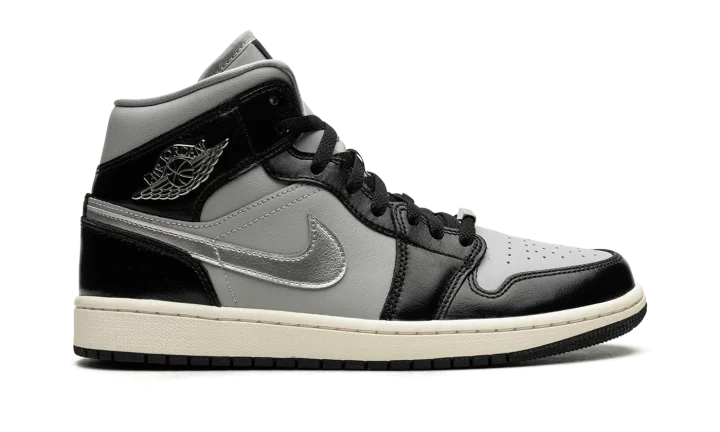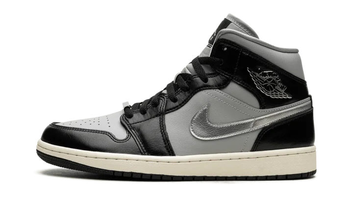 The Women's Air Jordan 1 Mid SE "Black/Chrome" is a women's-exclusive colorway of the casual sneaker with a versatile look. The upper features a Light Smoke Grey leather base contrasted with glossy black leather overlays. A Metallic Silver leather Swoosh is seen on both sides of the shoe. Classic "Wings" branding is found on the collar in metallic silver. A chrome lace dubrae is found on the vamp. An off-white hue for the midsole cadds an aged effect. Release date: October 3, 2023
