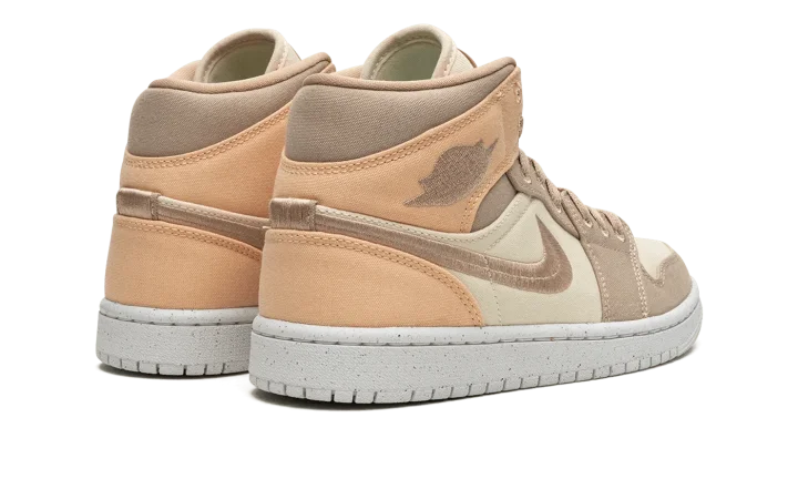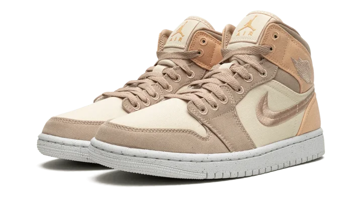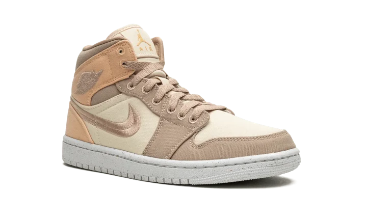 The Women's Air Jordan 1 Mid SE "Canvas Khaki" is a women's-exclusive colorway with a casual, neutral-based design. The "Canvas Khaki" Jordan 1 Mid features a Muslin-colored base with khaki canvas overlays on the toe cap, forefoot, and eyelets. A lighter shade of tan appears on the canvas panels on the collar and heel. A Muslin-colored Swoosh is embroidered on the sides and a blank "Wings" logo is embroidered on the collar. The white rubber midsole with speckle detailing completes the look. Release date: April 17, 2023
