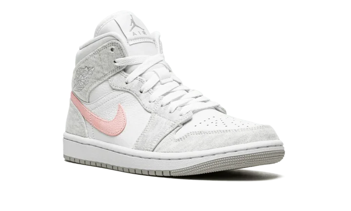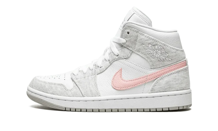 The Women's Air Jordan 1 Mid SE "Heather Grey/Pink" is a casual colorway of the women's version of Michael Jordan's first signature shoe. From Jordan Brand's Spring 2022 collection, the "Heather Grey/Pink" features heather grey canvas overlays against a crisp white tumbled leather base. A pink leather Swoosh is found on both sides of the shoe and a tonal "Wings" logo is located on the collar. On the tongue, a silver Jumpman with "Air" branding adds a classic Jordan 1 look. Underfoot, a white rubber midsole and grey outsole complete the look.