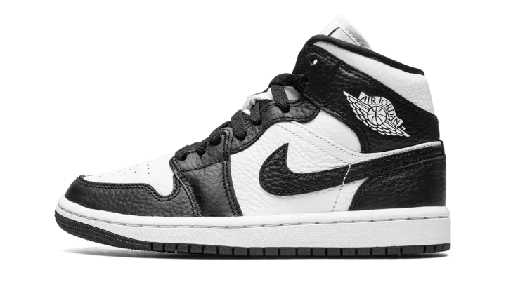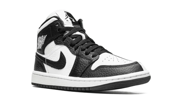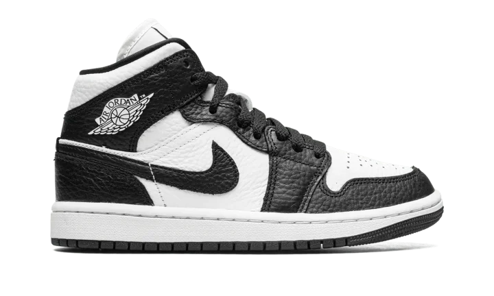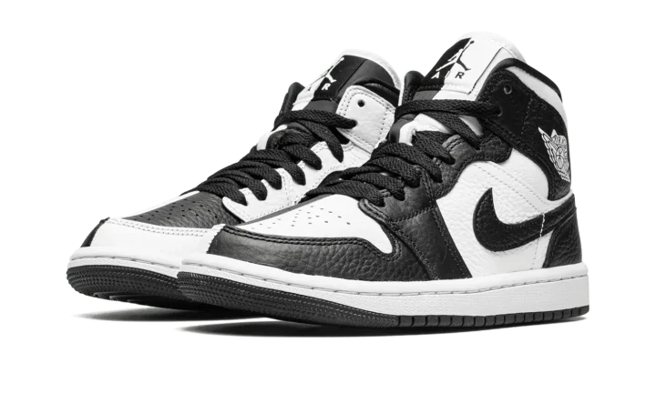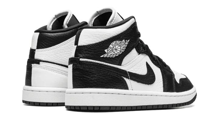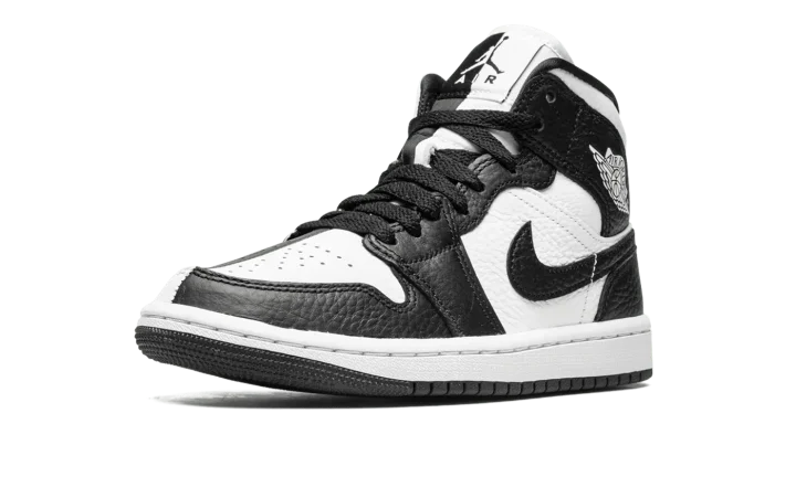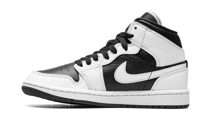 The Women's Air Jordan 1 Mid "Split Black and White" is a women's-exclusive colorway with a mismatched design. As its name implies, the "Split Black and White" Jordan 1 Mid features a split appearance that inverses the shoe's black-and-white color block on each side. The lateral side of the shoe features a white tumbled leather base with contrasting black leather overlays and Swoosh branding. The medial side reverses the color block, with a black leather base with white leather overlays and Swoosh branding. The black-and-white split design continues on both the tongue and tongue tag.