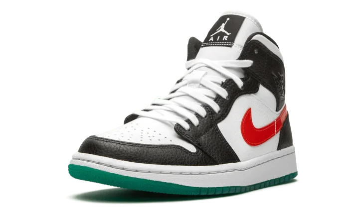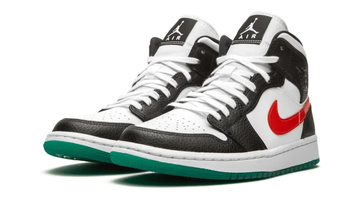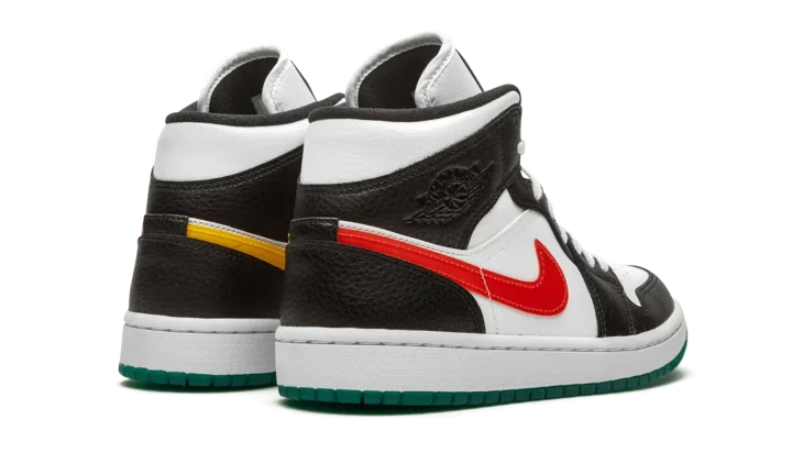 The Women's Air Jordan 1 Mid "Alternate Swooshes" shuffles the design of Michael Jordan's first signature shoe in mid-top height with alternating Swoosh logo colors. Fitted in women's sizing, this Jordan 1 Mid features a unique appearance that caters to the lifestyle look. Key design elements include white leather detailing on the perforated toe, mid-panel, and collar. Contrasting black tumbled leather overlays on the forefoot, eyelets, collar, and heel stand out against the crisp white base. A University Red leather Swoosh can be found on the outside of the shoe and a yellow leather Swoosh dots the inside portion. Additional branding appears in the form of tonal "Wings" logos on the collar and white Jumpman motif on the black nylon tongue tab. A crisp white nylon tongue and white cotton laces finish off the look.