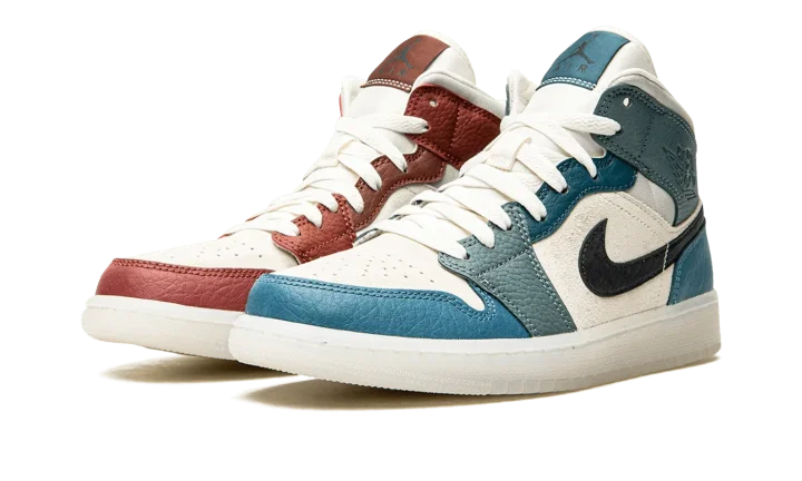 The Women's Air Jordan 1 Mid "Anti-Gravity Machines" is a women's-exclusive, mismatched colorway of Michael Jordan's first signature shoe that makes a tongue-in-cheek reference to Jordan Brand's "Air Jordan" line. The "Anti-Gravity Machines" suggests a casual, lifestyle design with both its clever nickname and colorway, which features various shades of Hyper Royal leather panels on the left shoe and Bordeaux-esque leather panels on the right shoe. Both the left and right shoe are constructed with a Sail leather base that allows for their respective overlays to attract attention. A black tumbled leather Swoosh is found on both shoes. Other details include "Wings" branding on the collar and the phrase "Anti-Gravity Machines" on the heel. Classic Jumpman and "Air" detailing appears on the blue and red tongue tags on the left and right shoe, respectively.