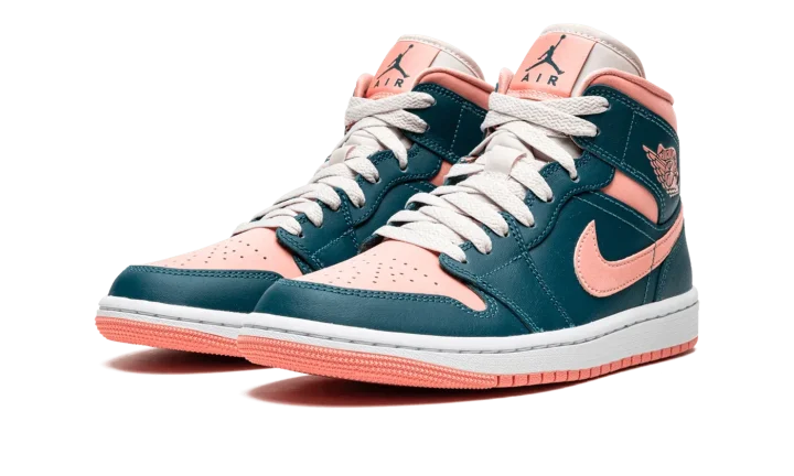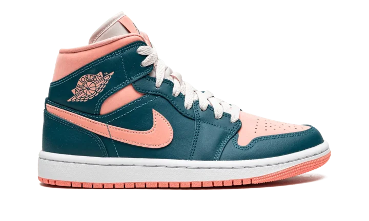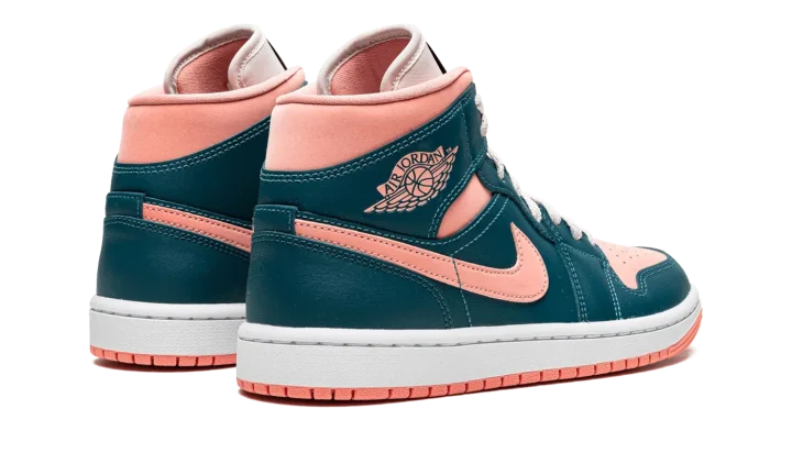 The Women's Air Jordan 1 Mid "Dark Teal Green" is a women's-exclusive colorway of the mid-top version of Michael Jordan's classic basketball shoe that's primed for warm weather wear. The "Dark Teal Green" elicits a spring and summer vibe with its use of bold colors, specifically with the dark teal leather that appears on the toe cap, forefoot, eyelets, mid-panel, collar, and heel. The perforated toe, collar, Swoosh, and "Wings" logo are featured in pink. Elsewhere, vintage inspired cream laces are layered over the cream nylon tongue.