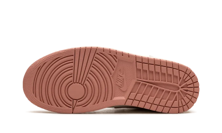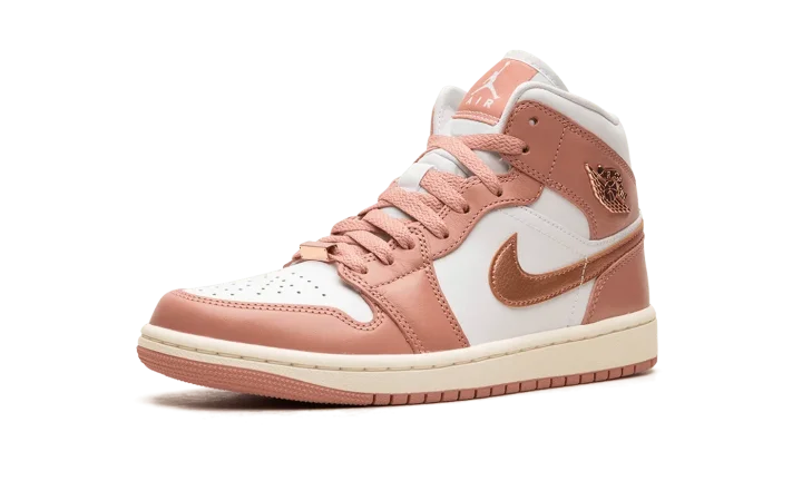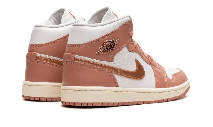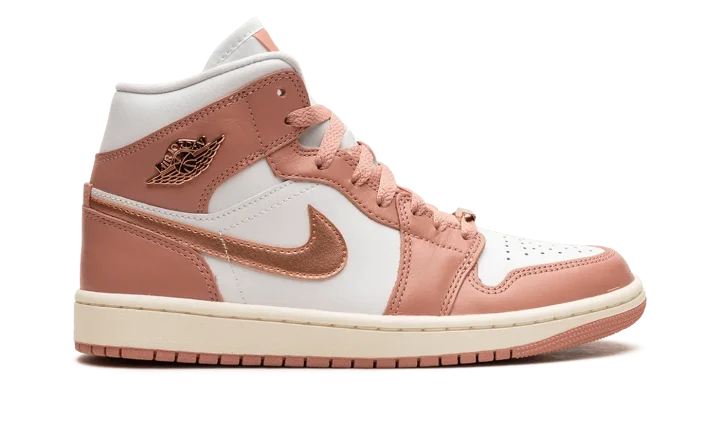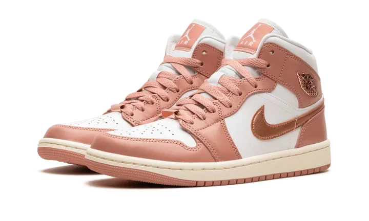 The Women's Air Jordan 1 Mid "Red Stardust" is a women's-exclusive colorway of the casual shoe with an opulent design. A premium look for the Jordan 1 Mid, the upper features a white leather base with Red Stardust-colored leather overlays. A metallic pink Swoosh appears on the sides while a metal "Wings" logo is seen on the collar. Jumpman detailing is found on the tongue tag. A metallic lace dubrae adds to the shoe's unique charm. Underfoot, an aged midsole completes the look. Release date: October 19, 2023