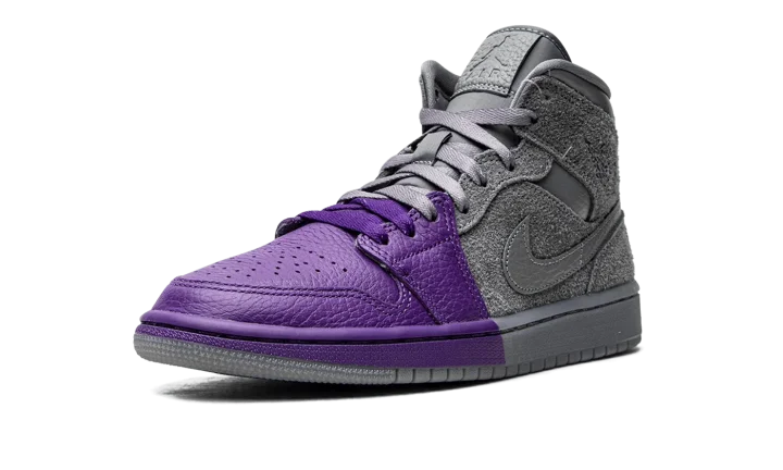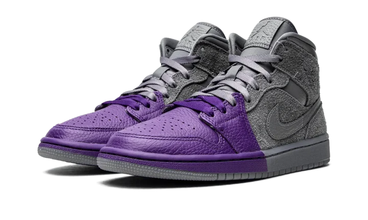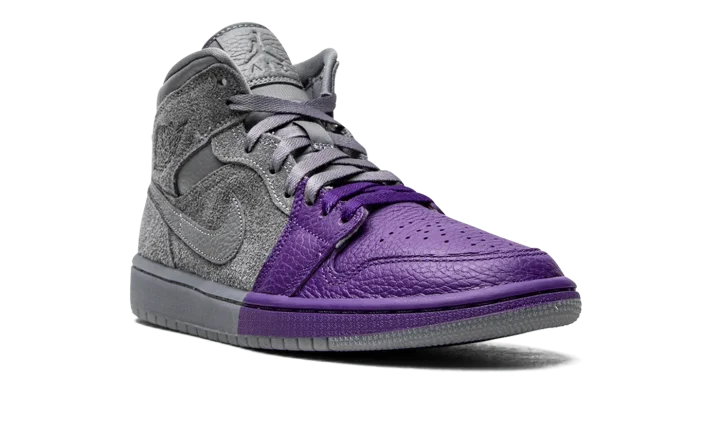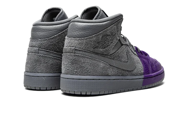 The Sheila Rashid x Air Jordan 1 Mid "Unite" is a collaboration between the bespoke designer and Jordan Brand as part of the Unite campaign. Here, Michael Jordan's first signature shoe is lowered in height to the mid-top silhouette, and features a distinct color block. Court Purple tumbled leather appears on the perforated toe and forefoot. From the mid-panel on, grey suede detailing is introduced into the design. The hairy material dots the mid-panel, collar overlay, and heel. Tonal "Wings" insignia is located on the collar. Leather Swooshes appear on either side of the shoe. The grey nylon tongue and tongue tag with Jumpman detailing are contrasted by purple accenting on the throat and laces. The midsole continues the split color blocking with purple paint in the same area as the upper. Release date: March 2, 2020.