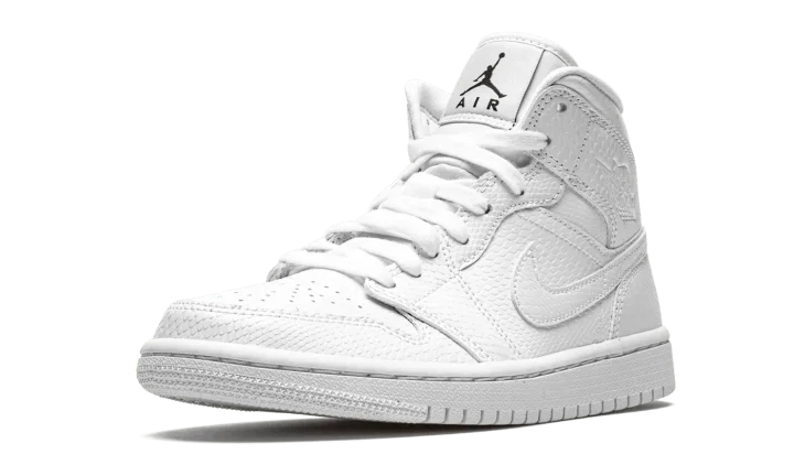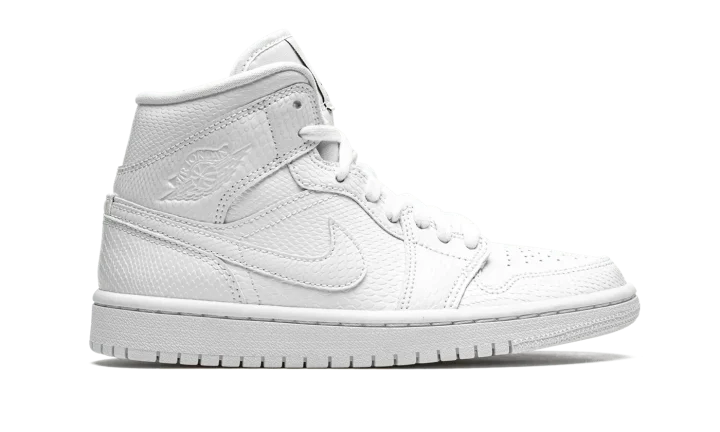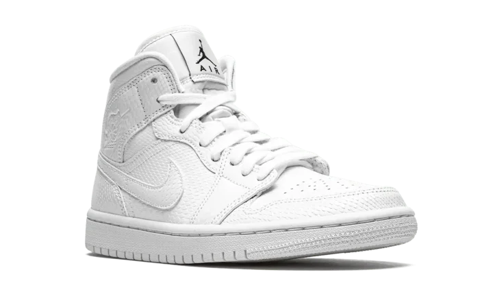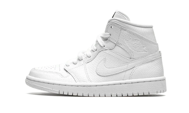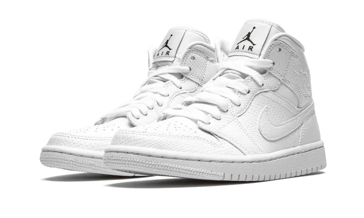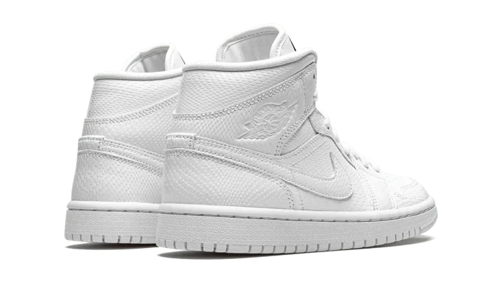 The Women's Air Jordan 1 Mid "White Snakeskin" is a women's exclusive edition of Michael Jordan's first signature shoe in a luxurious white monochromatic colorway. Versatile in every sense of the word, the "White Snakeskin" is dressed in an all-over white leather faux snakeskin construction. The Swoosh and "Wings" branding on the mid-panel and collar, respectively, feature the upscale design, as well. Additional details include black Jumpman and "Air" branding on the white nylon tongue tag, a white nylon tongue, and white shoelaces. The crisp all-white-everything vibe continues underfoot with a white rubber midsole and outsole.