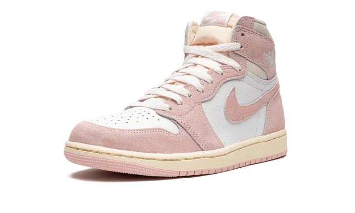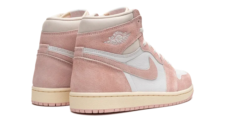 The Women's Air Jordan 1 High OG "Washed Pink" is a women's-exclusive colorway of Michael Jordan's first signature shoe with a decidedly warm weather vibe. The "Washed Pink" features a white leather base with Washed Pink suede overlays and Swoosh branding on the sides. A "Wings" logo appears on the collar and "Nike Air" detailing is found on the tongue tag. The shoe's cream-colored leather collar and midsole gives the design an aged, vintage look. Release date: April 22, 2023
