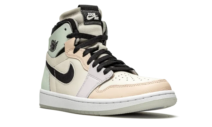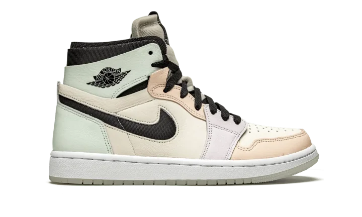 The Women's Air Jordan 1 High Zoom CMFT "Easter" is a women's version of the modern remake of Michael Jordan's first signature shoe in a colorway inspired by the springtime holiday. Arriving in pastel colored panels, the "Easter" Jordan 1 Zoom CMFT was released by Jordan Brand in Spring 2021 in the soft and airy hues commonly associated with Easter. The updated Zoom CMFT edition of the Jordan 1 features even more padding around the collar than the standard Jordan 1 model and Nike's Zoom Air technology in the sole. As for this design, cream leather appears on the perforated toe and mid-panel. The eyelets and toe cap are dressed in tan tumbled leather. Both the collar and heel feature a light mint green leather construction. A black mesh Swoosh can be found on either side and a black "Wings" logo resides on the collar. Exposed foam padding peers out from the front of the collar. The brown mesh tongue features a "Zoom Air" branded tongue tag. Zoom Air technology is embedded within the sole for all-day comfort. Release date: Spring 2021.
