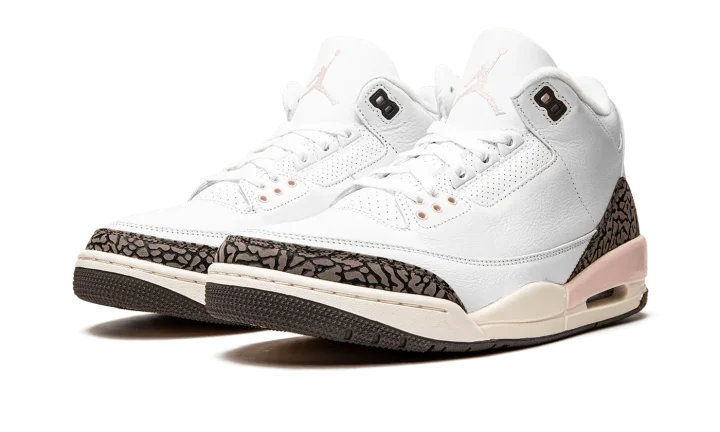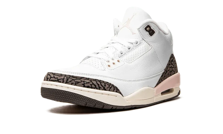The Women's Air Jordan 3 "Dark Mocha" is a women's-exclusive release of the retro basketball shoe that nods to a popular, non-original colorway of the model. From Jordan Brand's Spring 2022 collection, the "Dark Mocha" or "Neapolitan," as it is also known as, salutes to the Air Jordan 3 "Mocha." The "Dark Mocha" is arranged in the same color block as the original "Mocha" Jordan 3, albeit with a few light pink accents sprinkled into its design. The upper is constructed from white tumbled leather. The Jordan 3's iconic elephant patterning found on the toe and heel are designed in a shade of dark brown. A Jumpman logo is paired with "Air" branding on the heel and an Atmosphere—or pink—Jumpman is embroidered on the white leather tongue. Release date: May 14, 2022