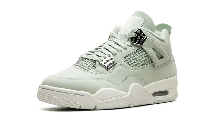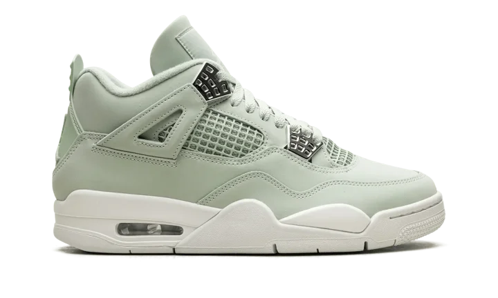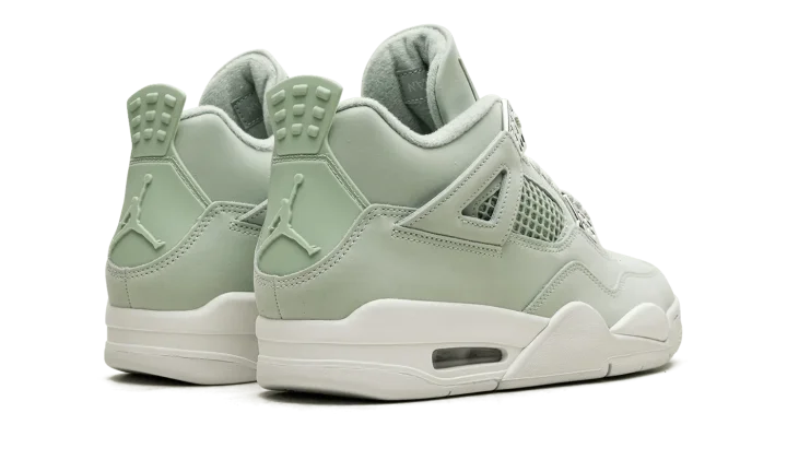 The Air Jordan 4 "Seafoam" is a women's colorway of Michael Jordan's fourth signature shoe. This Jordan 4 has a clean, light green upper that is balanced with a white midsole. The "Seafoam" AJ4 incorporates the signature design details of the Air Jordan 4, including the mesh panels and wings on the side. A tonal Jumpman logo appears on the heel.