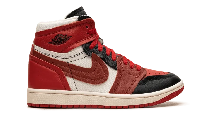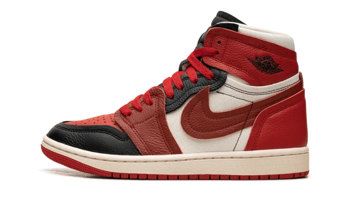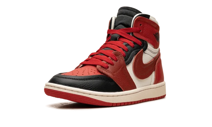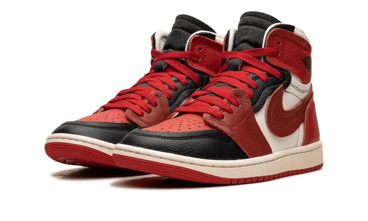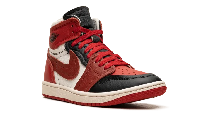 The Women's Air Jordan 1 High MM "Sport Red" is the women's sizing of the modified version of the retro basketball shoe with a layered aesthetic. The Jordan 1 High MM is made from a unique combination of leather and canvas materials layered on top of one another. Specifically, the shoe has layered and raised overlay panels that give the design a head-turning look. The upper features a Sport Red perforated leather toe contrasted with a Dune Red raised leather overlay on the forefoot, a black raised leather overlay on the middle eyelet panel, and a black leather toe cap. A raised oversized Dune Red leather Swoosh appears on both sides, while raised red leather overlays can be found on the collar and heel.