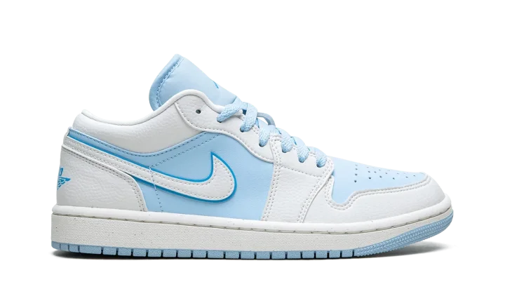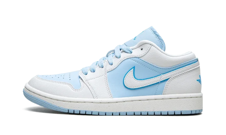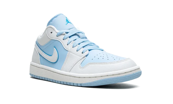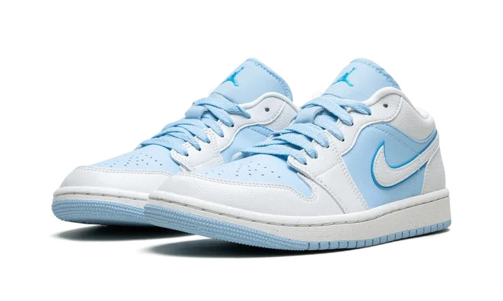 The Women's Air Jordan 1 Low SE "Ice Blue" is a women's-exclusive colorway of the low-top retro basketball shoe with a decidedly "UNC" inspired vibe. The shoe features an Ice Blue perforated leather toe, mid-panel, and nylon tongue. Contrasting white leather appears on the toe cap, forefoot, eyelets, and heel. A white leather Swoosh is found on the sides and Ice Blue "Wings" branding is embroidered on the heel. A blue Jumpman is stitched onto the tongue. Release date: January 9, 2023