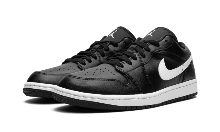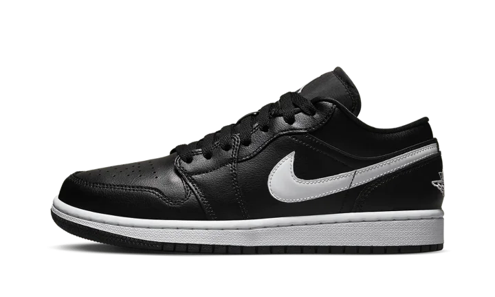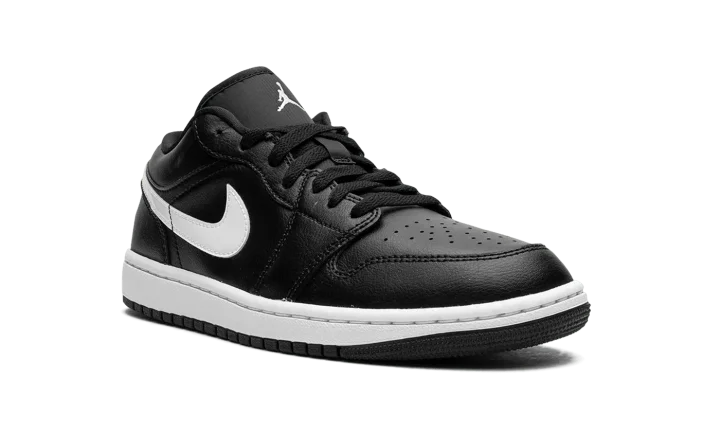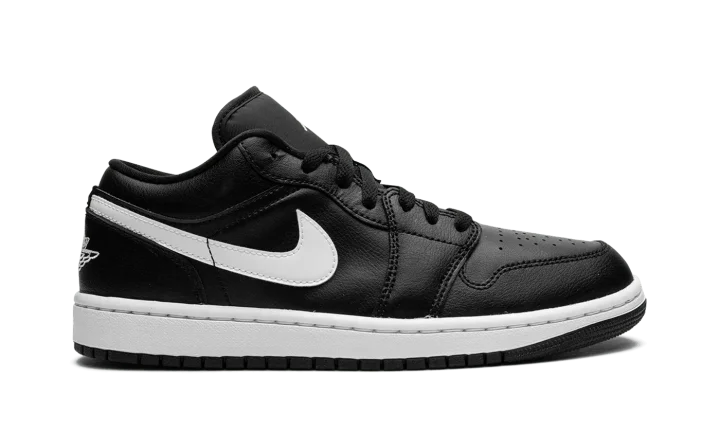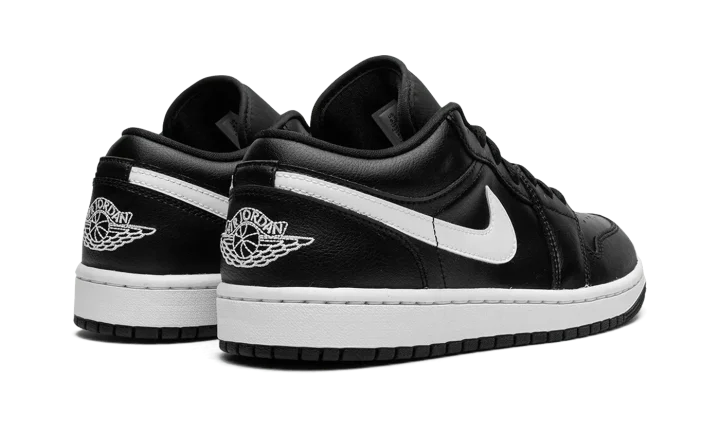 The Women's Air Jordan 1 Low "Black/White" is the women's sizing of the low-top retro basketball sneaker with a versatile color block. The upper features a black leather base and black leather overlays on the toe, forefoot, eyelets, collar, and heel. A white leather Swoosh contrasts the shoe's black-based appearance on either side. "Wings" branding is found on the heel while a Jumpman logo appears on the tongue tag. A white rubber midsole and black rubber outsole complete the clean and simple look. Release date: September 26, 2023