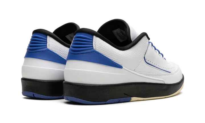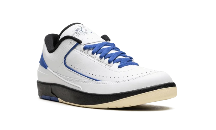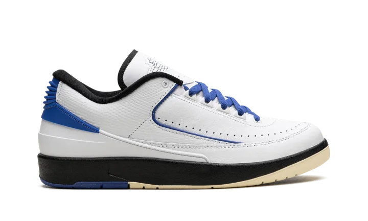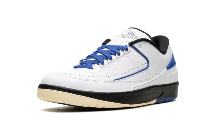 The Women's Air Jordan 2 Low "Varsity Royal" is a women's-exclusive colorway of Michael Jordan's second signature shoe with blue accents. This clean and sporty look for the Jordan 2 Low features a white leather construction with textured leather overlays with Varsity Royal piping. Additional Varsity Royal accenting appears on the heel counter, laces, and rubber outsole. As for the rest of the shoe, a tonal "Wings" logo is seen on the tongue and the black rubber midsole is paired with a split cream and royal blue rubber outsole. Release date: July 6, 2023