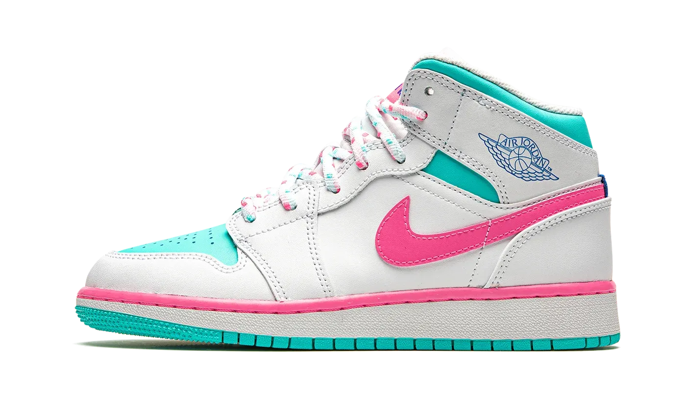 The Air Jordan 1 Mid GS "Digital Pink" is the youth sizing of Michael Jordan's first signature shoe in a bright and vibrant colorway. Appearing on the Jordan 1 Mid, the upper displays smooth white leather on the forefoot, mid-panel, collar, and heel. Eye-pleasing Aurora Green leather can be found on the shoe's perforated toe and underneath the collar overlay. A hue of pink leather called Digital Pink appears on the Swoosh branding on either side. Additional design elements include white speckled rope laces, a teal "Wings" logo on the collar, and pink detailing on the upper portion of the white rubber midsole.
