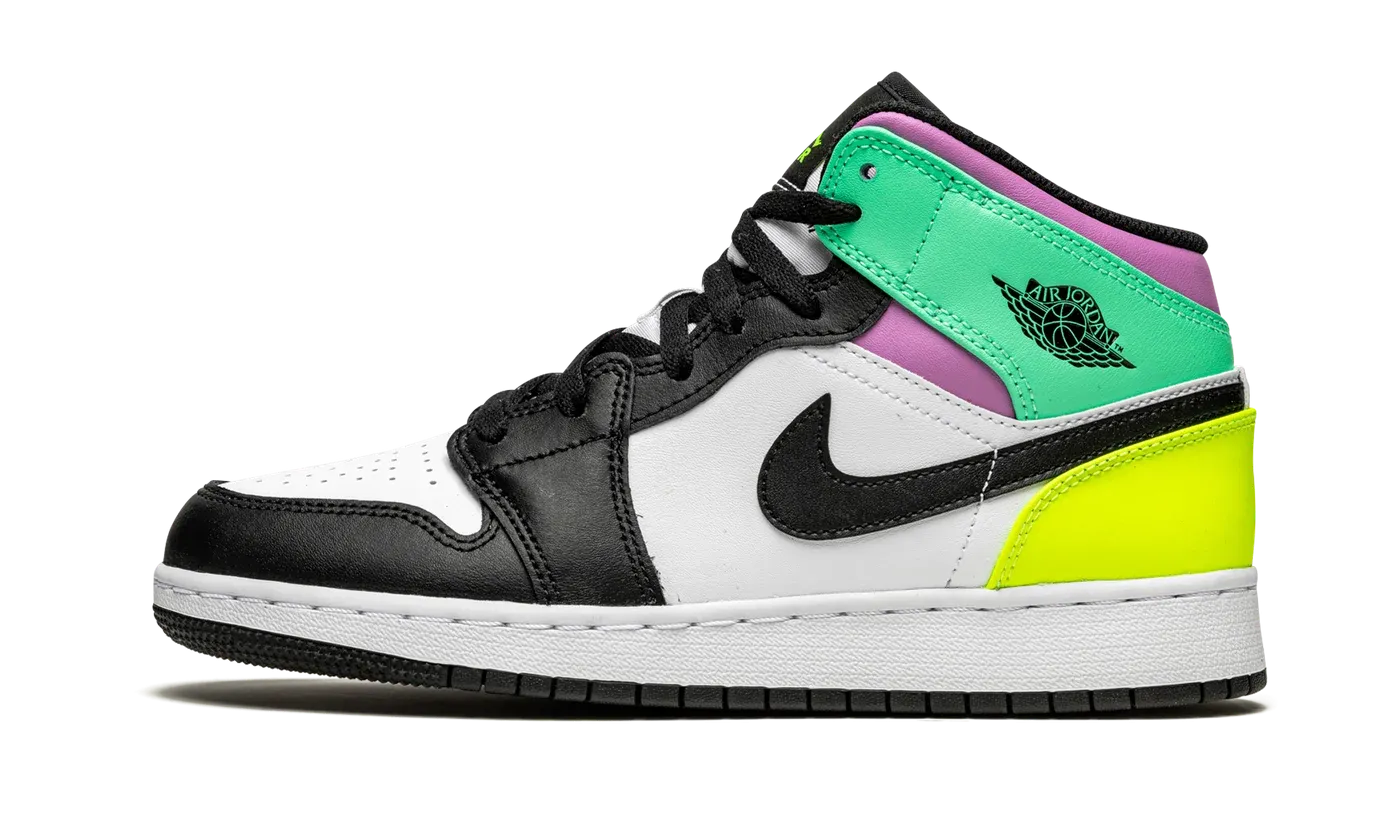 The Air Jordan 1 Mid GS "Pastel" is a vibrant, kids' exclusive colorway of Michael Jordan's first signature shoe in the popular mid-top silhouette. A combination of head-turning neon and pastel colors on the leather panels attracts attention on the "Pastel" Jordan 1 Mid. The forefoot, eyelets, and Swoosh feature a black leather construction. Both the perforated toe and the mid-panel are designed in white leather. A black "Wings" logo appears on the Green Glow leather panel layered above the purple leather collar. A contrasting Volt leather panel can be found on the heel. Additional Volt accenting appears on the Jumpman and "Air" branding on the black nylon tongue tag. Black laces, a white nylon tongue, and a white midsole and black outsole complete the look.