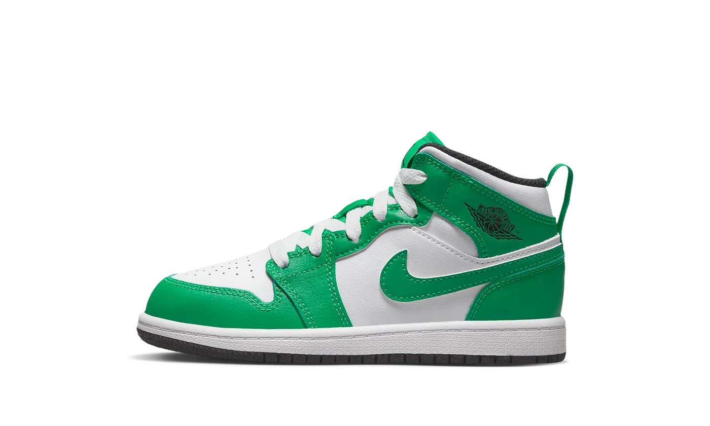 The Air Jordan 1 Mid PS "Lucky Green" is the preschool sizing for the colorway of the casual shoe that nods to the Boston Celtics. While not officially tied to the Celtics, the "Lucky Green" still features the basketball team's white-and-green team uniform colors on its design. The shoe is complete with a white leather base with Lucky Green leather overlays. A green leather Swoosh can be found on either side of the shoe and a black "Wings" logo appears on the collar. Additional branding includes a black Jumpman and an "Air" logo on the green tongue tag.