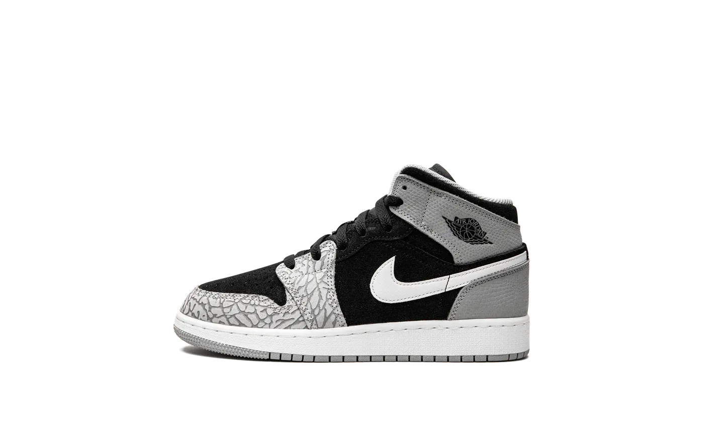 The Air Jordan 1 Mid GS "Elephant Toe" is the youth sizing of the retro basketball shoe in a colorway that features the same iconic patterning found on the Air Jordan 3. Originally released in 1988, the Jordan 3 was the first-ever basketball shoe to feature elephant-inspired detailing on its design when it was introduced with the animal-esque patterning on its toe cap and heel. Here, the "Elephant Toe" uses the same print as the Jordan 3 to great success. The material in question is found on the toe cap and forefoot. Contrasting black suede appears on the perforated toe and mid-panel. Textured grey leather is located on the collar and on the heel. A white leather Swoosh appears on the sides and a black "Wings" logo resides on the collar.