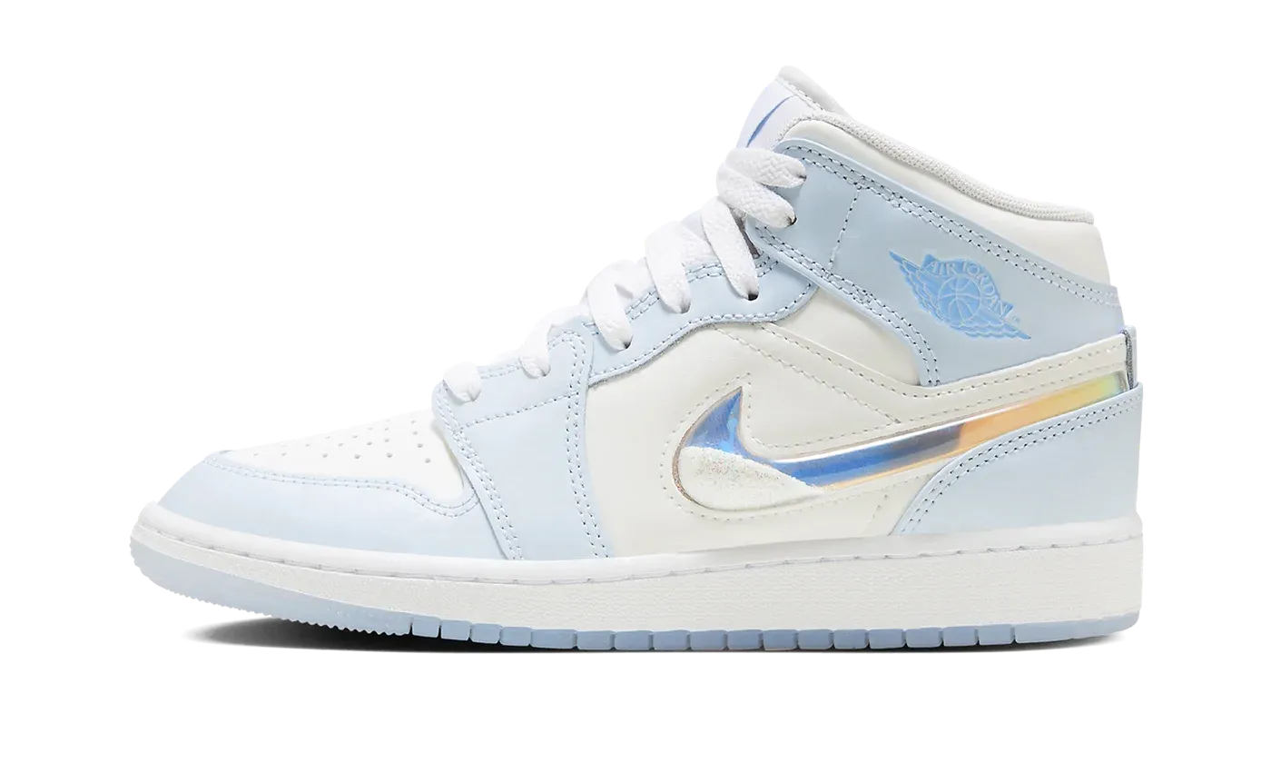 The Air Jordan 1 Mid GS "Glitter Swoosh" is the youth sizing of the mid-top shoe with a winter-inspired design. The upper features a white leather construction with Blue Tint leather overlays. The Swoosh on the lateral side is constructed in clear plastic with glitter that can move around inside it for a unique and fun look inspired by snow globes. A light blue "Wings" logo can be found on the collar, while a Jumpman appears on the tongue tag. Underfoot, a white midsole and icy blue translucent outsole complete the design. Release date: November 27, 2023