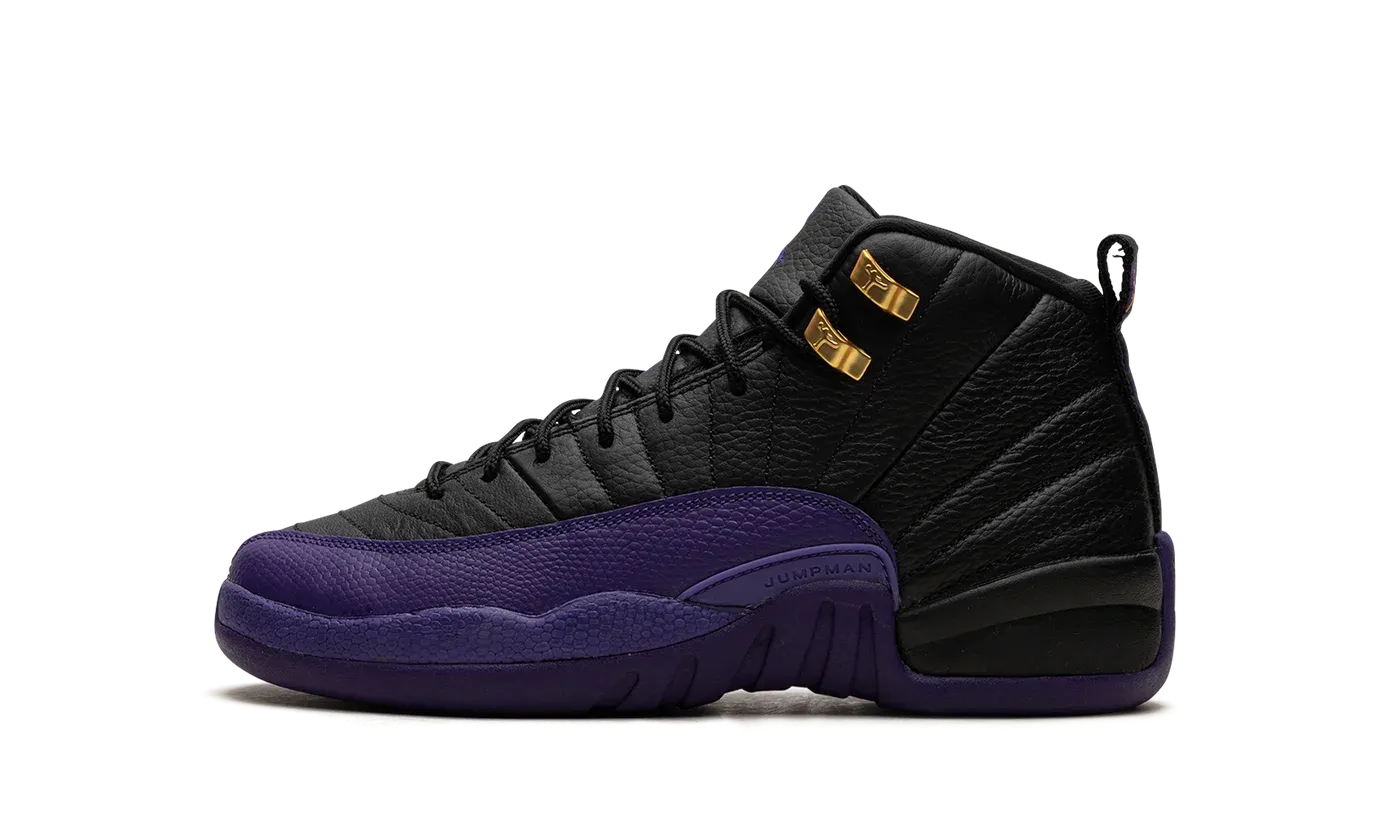 The Air Jordan 12 GS "Field Purple" is the youth sizing of the retro basketball shoe in a colorway seemingly inspired by the Player Exclusive version of the Jordan 12 worn by former Sacramento Kings point guard Mike Bibby in the early 2000s. Reminiscent of the Jordan 12 Low that Bibby wore frequently with the Kings, the "Field Purple" features a black leather upper with a purple textured leather mudguard. Metallic Gold eyelets give the shoe a premium look. Classic Jumpman branding appears on the lateral side of the midsole and purple Jumpman and "Two 3" detailing are embroidered on the black leather tongue. The shoe is mounted on a purple rubber sole. Release date: July 29, 2023