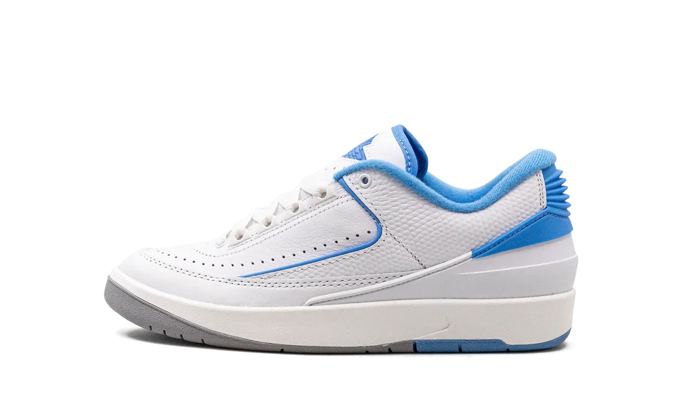 The Air Jordan 2 Low GS "University Blue" is the youth sizing of the retro basketball shoe inspired by Michael Jordan's college days at the University of North Carolina. The "University Blue" Jordan 2 for kids features features a white leather construction with University Blue piping along the white leather upper overlay. The "UNC" inspired hue is also found on the heel counter and on the inner lining. It also lands on the "Wings" logo on the tongue. An off white midsole and grey outsole complete the look. Release date: July 22, 2023