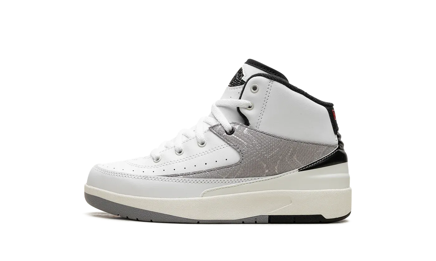The Air Jordan 2 PS "Python" is the preschool sizing of Michael Jordan's second signature shoe in a colorway inspired by the Nike Air Python. Debuted in 1987 and said to be a combination of the Nike Air Force 2 and Jordan 2, the Air Python features a faux lizard skin material on its design that inspires the reptilian detailing on the Jordan 2 "Python." The upper is complete with a white leather construction, and features a grey snakeskin pattern on its mid-panel overlay. An old school "Wings" logo is seen on the tongue, while a red "Nike" logo is embroidered on the heel. Underfoot, a Sail midsole sits on top a Cement Grey rubber outsole. Release date: January 20, 2024