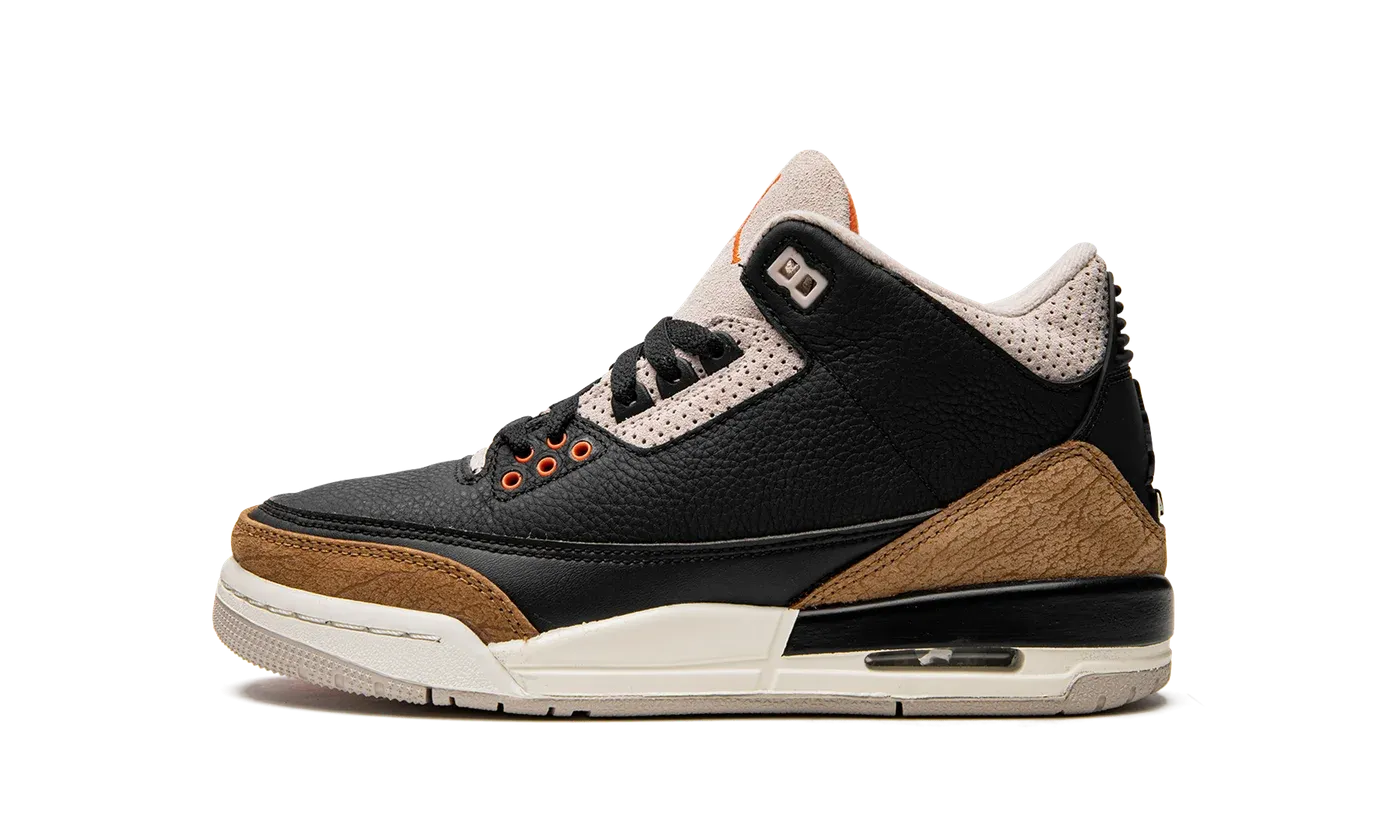 The Air Jordan 3 GS "Desert Elephant" is the youth sizing of the colorway that updates an iconic design in the retro basketball shoe's collection. Inspired by the Jordan 3's original "Black Cement" colorway, the "Desert Elephant" features a similar color block, albeit with a few twists. Like the original "Black Cement," the "Desert Elephant's" upper is designed in black leather. Instead of grey elephant print on the toe and heel per the original colorway, this version dons brown elephant patterning. Dotted grey leather appears on the middle eyelets and collar. An orange Jumpman is embroidered on the grey suede tongue. A small visible Air unit is found in the heel of the white foam midsole to complete the look. Release date: July 30, 2022
