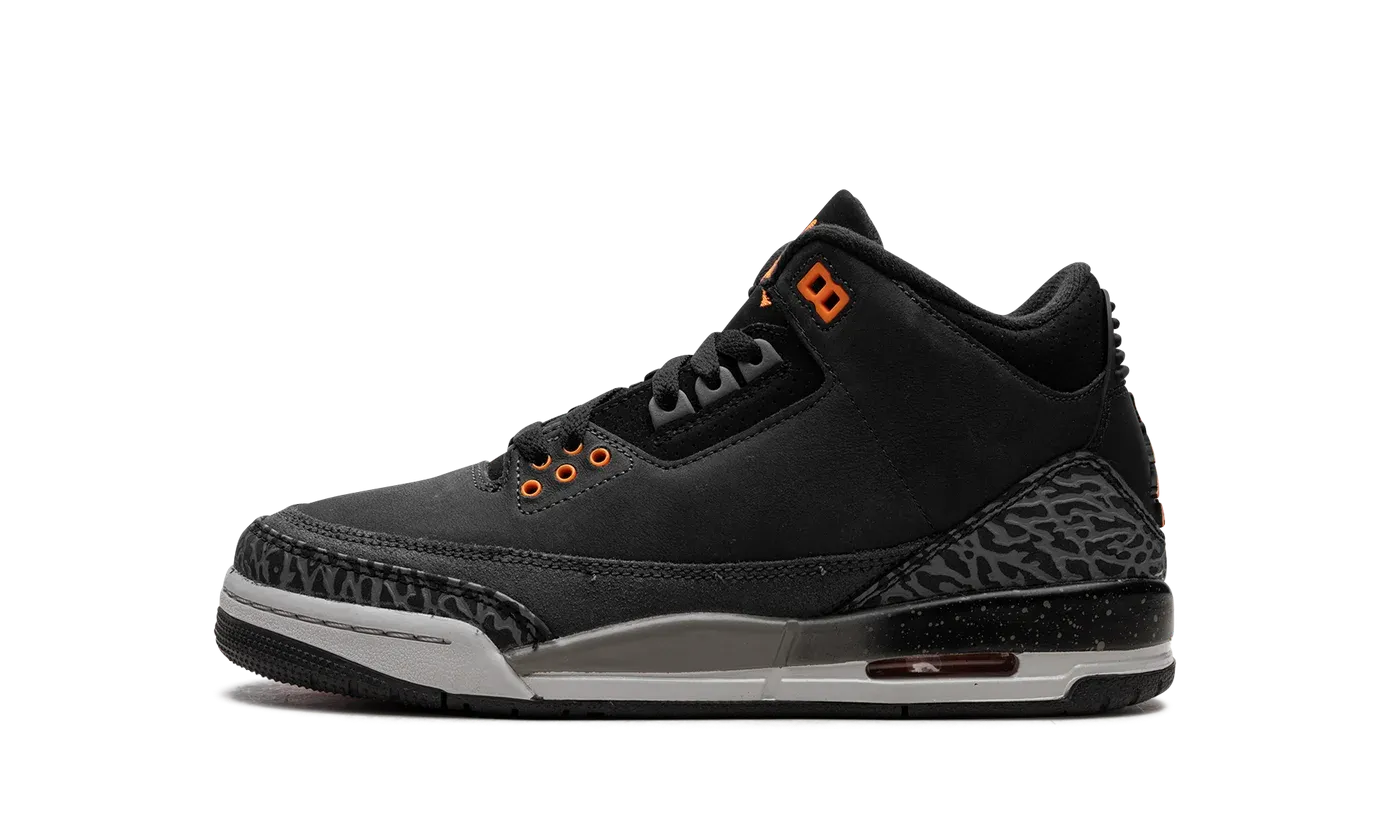 The Air Jordan 3 GS "Fear Pack" is the youth sizing of the 2023 re-release of the colorway of Michael Jordan's third signature shoe that originally debuted in 2013. Inspired by 2008's "Become Legendary" campaign that featured Jordan Brand athletes Carmelo Anthony, Derek Jeter, Joe Johnson, and more, the Jordan 3 "Fear Pack" or simply "Fear" was originally released alongside an Air Jordan 4 and Air Jordan 5 in "Fear" colorways. As for the Jordan 3 "Fear," the shoe is complete with a Night Stadium suede construction with elephant print on the toe and heel. Total Orange accents are found on the eyelets, on the Jumpman on the tongue and on the heel, and on the rubber outsole. A black mudguard with speckle detailing completes the look. Release date: November 25, 2023