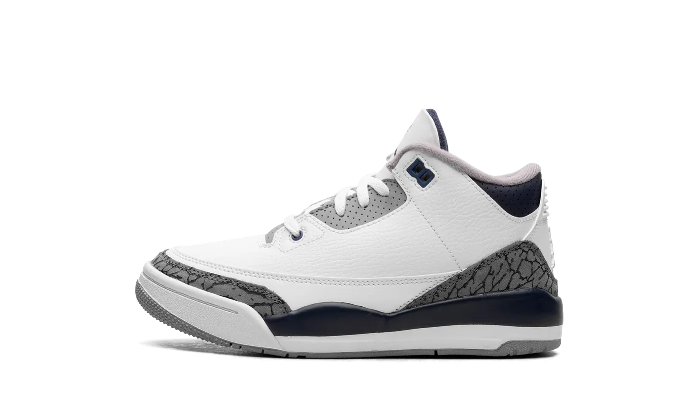 The Air Jordan 3 PS "Midnight Navy" is the preschool sizing of Michael Jordan's third signature shoe with navy accents. The "Midnight Navy" colorway features a white leather upper with elephant print overlays on the toe and heel. A Midnight Navy-colored mudguard contrasts the look, as do the Midnight Navy eyelet holes. More Midnight Navy accenting is featured on the Jumpman on the white leather tongue and on the Jumpman on the heel. The white midsole has a clear Air bubble in the heel. A grey rubber outsole completes the look. Release date: January 13, 2024