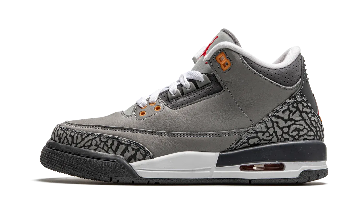 Embrace a timeless favorite with the Air Jordan 3 Retro GS "Cool Grey." This Grade School-sized sneaker is a highly anticipated reissue of the popular 2007 colorway. It features a sleek Cool Grey leather upper accented by the signature elephant print overlays in a matching tonal shade. Subtle but vibrant pops of Orange Peel and Sport Red on the molded eyelets and Jumpman branding break up the neutrals. With visible Air cushioning, this shoe delivers both legendary style and supreme comfort.