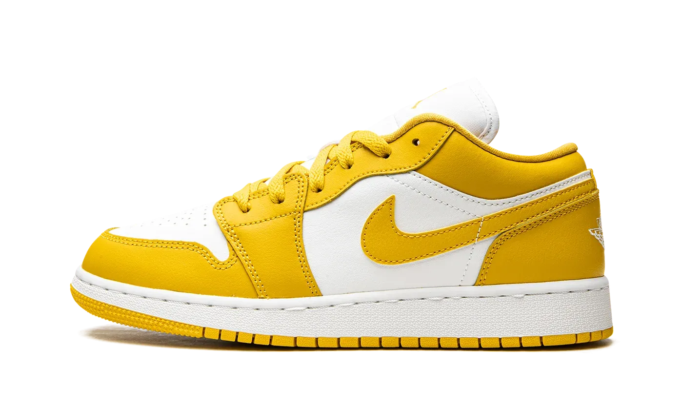 The Air Jordan 1 Low GS "White/Pollen" is the kids sizing of Michael Jordan's first signature shoe in a two-tone, yellow-and-white colorway reminiscent of popular Nike Dunk styles. Both designed by Peter Moore in 1985, the Jordan 1 and Dunk share a similar appearance, even more so when Michael Jordan's first signature shoe is designed in a colorway that mimics the styling of an original colorway of the Dunk. White leather appears on the perforated toe and mid-panel. Contrasting yellow or Pollen leather is found on the forefoot, eyelets, collar, heel, and Swoosh. A white "Wings" logo is embroidered on the heel. A yellow Jumpman and Pollen-colored laces can be found on the white nylon tongue.