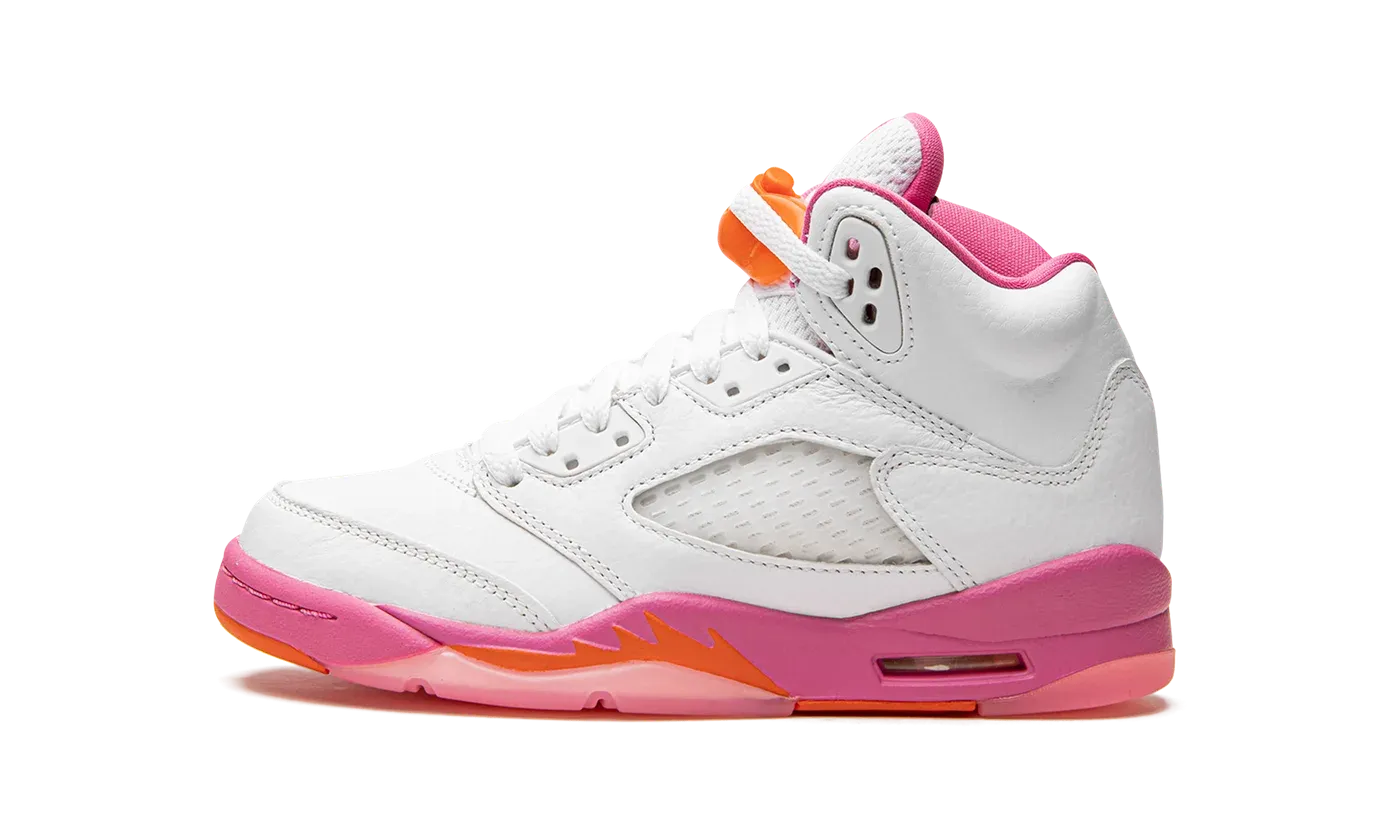 The Air Jordan 5 GS "Pinksicle" is the youth sizing of Michael Jordan's fifth signature shoe in a casual colorway with a spring and summer vibe. The "Pinksicle" brings a laidback look to the vintage basketball shoe. The shoe's upper is constructed in white leather. Translucent netting appears on the mid-panel and on the tongue. A Pinksicle-colored Jumpman is embroidered on the back of the shoe and on the tongue. An orange lace lock breaks up the design's neutral-based appearance. Orange shark tooth detailing appears on the pink midsole. Release date: July 1, 2022