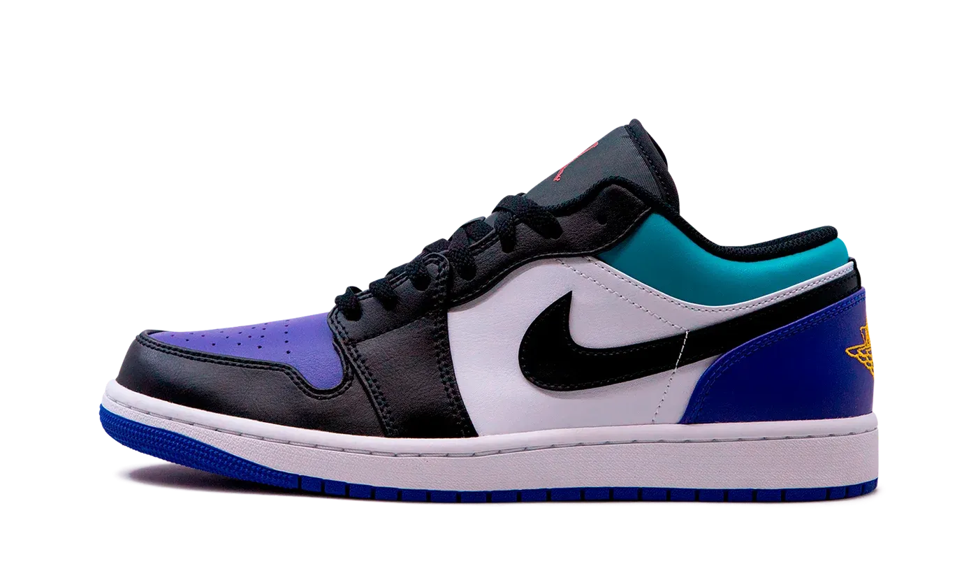 The Air Jordan 1 Low "Aqua" is a colorful look for the versatile low-top Jordan 1. This head-turning design features a Court Purple perforated leather toe box and a purple leather heel panel. Contrasting black leather can be found on the toe cap, forefoot, eyelets, and Swoosh. A shade of teal called Tropical Twist appears on the collar. Classic "Wings" branding is seen on the heel in yellow, while a red Jumpman appears on the tongue. A white midsole and Court Purple outsole complete the colorway that is loosely inspired by the iconic Air Jordan 8 "Aqua."