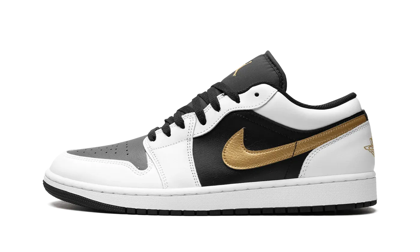 Step into a classic with a touch of luxury with the Air Jordan 1 Low "Gold Swoosh." This celebrated silhouette features a clean white leather upper accented by a striking metallic gold Swoosh. Experience comfortable cushioning and a versatile look, perfect for making a bold statement with a sophisticated edge.