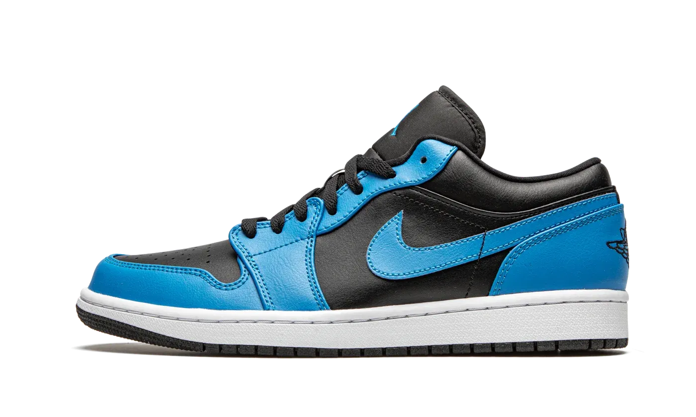 The Air Jordan 1 Low "Laser Blue" is an intriguing colorway of Michael Jordan's iconic first signature shoe in the versatile low-top silhouette. Released in Fall 2020, this Jordan 1 follows a similar color block to the "Bred" colorway of the Jordan 1 in that it features a black leather base, but instead of red, "Laser Blue" accenting appears in its place. The bright shade of blue can be found on the forefoot, eyelets, and heel. It also appears on the Swoosh insignia found on either side, and on the mini Jumpman emblem on the black nylon tongue. Black "Wings" embroidery is located on the heel.