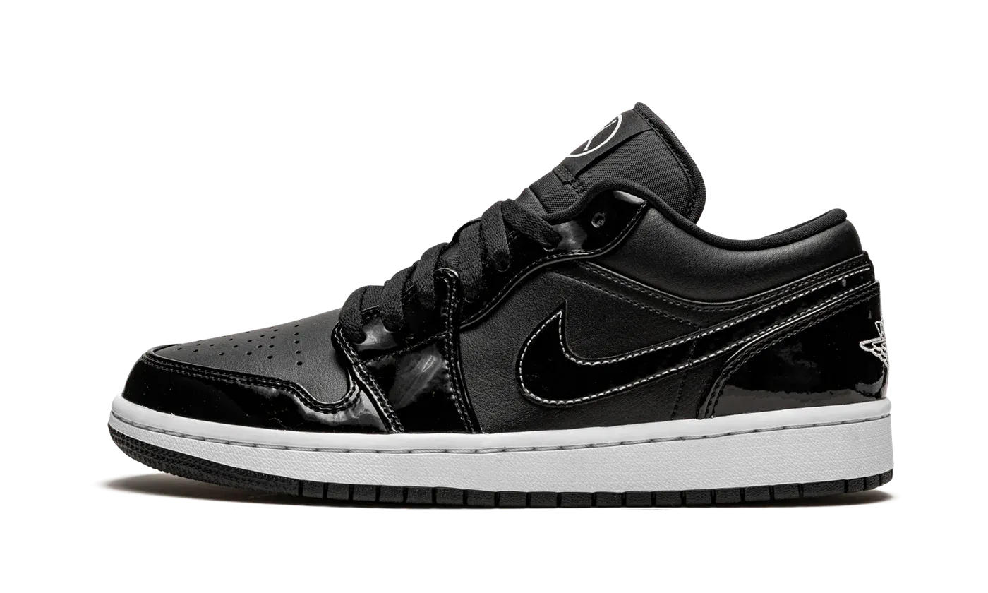 The Air Jordan 1 Low SE "All-Star 2021" is a colorway of Michael Jordan's first signature shoe in its low-top style dedicated to the 2021 NBA All-Star Game. Like the Air Jordan 1 Mid of the same nickname, the Jordan 1 Low "All-Star 2021" is dressed in an appealing two-tone black-and-white color scheme. A glossy black leather synthetic material appears on the overlaid panels found on the forefoot, eyelets, collar, and heel. Tonal matte black leather forms the base of the shoe on the perforated toe, mid-panel, and collar. White contrast stitching outlines the black leather Swoosh branding on either side and a white "Wings" logo is embroidered on the back of the shoe. Blacked-out "23" insignia on the lace overlay pairs with the circular Jumpman detailing on the tongue to inspire a unique look for the Air Jordan 1. Release date: February 2021.