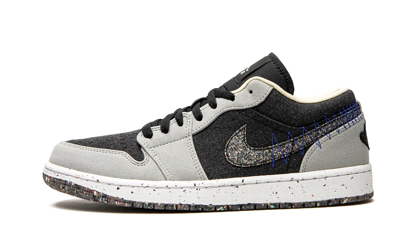 The Air Jordan 1 Low Crater "Light Smoke Grey" is an environmentally friendly version of the retro basketball shoe that was released in Fall 2021. A core offering from Nike's "Move to Zero" initiative that places an emphasis on sustainability, the Jordan 1 Low Crater is an alternative to the standard Air Jordan 1 Low that is constructed from recycled materials. A lightweight black textile appears on the shoe's perforated toe, mid-panel, and collar. The overlays are constructed from grey suede. A multicolor, threaded Swoosh composed of Nike Grind straps can be found on both sides and a modified, raised "Wings" graphic appears on the heel. Multicolor speckling on the white midsole and a Nike Grind outsole complete the look.