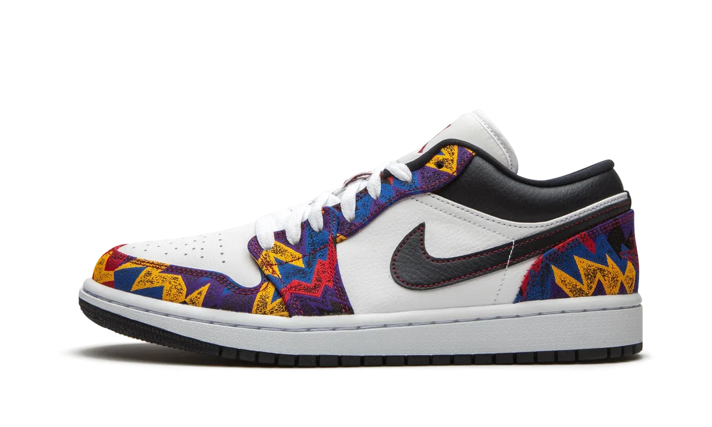 The Air Jordan 1 Low "Nothing But Net" riffs on the funky multicolor shirt worn by Michael Jordan during media appearances for the 1992 Summer Olympics and in a classic Super Bowl commercial from 1993. The pattern used on the shoe may look familiar to sneaker fans and collectors who remember it appearing on the Jordan 7 of the same nickname from 2015. Here, the upper of the Jordan 1 Low displays white perforated leather on the toe and smooth white leather on the mid-panel. The aforementioned geometric pattern dots the toe cap, forefoot, eyelets, and heel. A black Swoosh with contrast red outline stitching graces either side and a red embroidered Jumpman is placed on the white leather tongue. The black leather collar, white midsole, and black outsole complete the look. Release date: Summer 2020.
