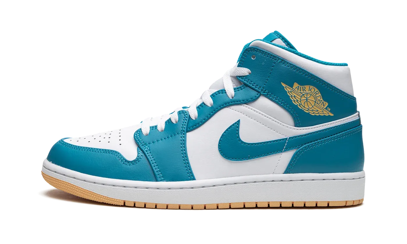 The Air Jordan 1 Mid "Aquatone" is a colorway of the mid-top lifestyle shoe with a can't-miss design. A release from Jordan Brand's Spring 2023 collection, the "Aquatone" Jordan 1 Mid features a white leather base with Aquatone leather overlays and leather Swoosh branding. A gold "Wings" logo appears on the collar, and a gold Jumpman can be found on the aqua-colored tongue tag. The shoe is mounted on a white rubber midsole and gum outsole. Release date: April 11, 2023