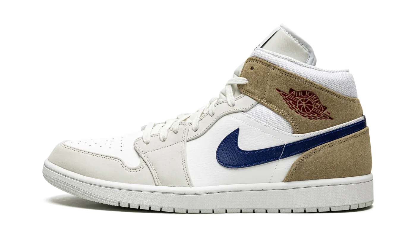 The Air Jordan 1 Mid "Tan Suede" is a colorway of the popular mid-top lifestyle shoe that can be worn with ease in all four seasons. An essential component of any great sneaker collection, the Jordan 1 Mid is both comfortable and timeless in design. On the "Tan Suede," the shoe's upper features white leather on the perforated toe and mid-panel. The forefoot and eyelet overlays are designed in light grey suede. A Blue Void-colored leather Swoosh is found on the sides and a dark red "Wings" logo resides on the collar. The collar overlay and heel are featured in khaki suede. A blue Jumpman logo appears above the "Air" branding on the white nylon tongue tag.