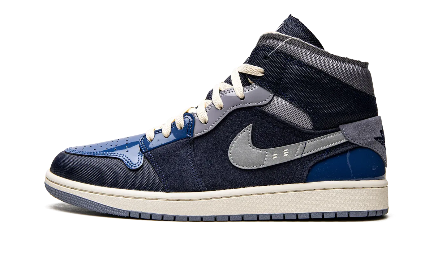 The Air Jordan 1 Mid SE Craft" Obsidian" is an alternate version of the lifestyle shoe that updates its design with an "inside-out" spin. The "Obsidian" gives the Jordan 1 Mid Craft a unique look with mismatched panels in various textiles. Blue-colored patent leather can be found on the perforated toe and lower eyelet while Obsidian suede appears on forefoot and mid-panel. The blue hue also graces the toe cap and heel. A grey Swoosh is found on the sides. An overlay panel with "Wings" branding is located on the back of the shoe, moved from its placement on the collar on the Air Jordan 1 Mid's original design.