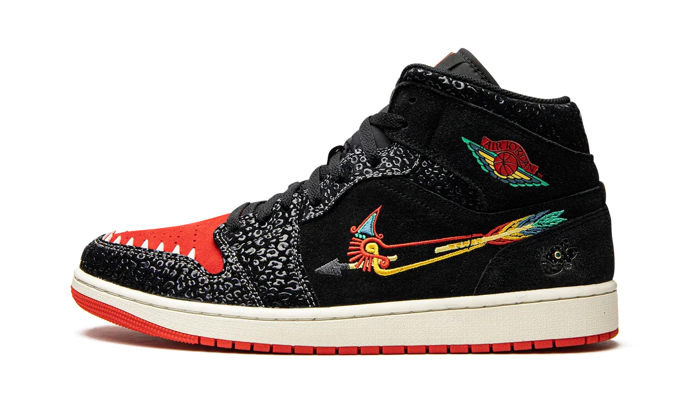 The Air Jordan 1 Mid SE "Siempre Familia" is a special edition of the classic basketball shoe released as part of Nike's "Dia de los Muertos" collection honoring the traditional Mexican holiday. A creative look for the Air Jordan 1 Mid, the "Siempre Familia" is a colorway inspired by Mictlán, the underworld of Aztec mythology that spans nine levels. Details include animal-inspired graphics and prints that reference those that usher one into the afterlife. The upper features a predominantly black appearance with unique details such as textured overlays and a modified bow-and-arrow-style Swoosh. The "Wings" logo is designed in a multicolor look inspired by "Dia de los Muertos." Jaguar-inspired teeth border the red perforated toe box. Release date: October 29, 2021
