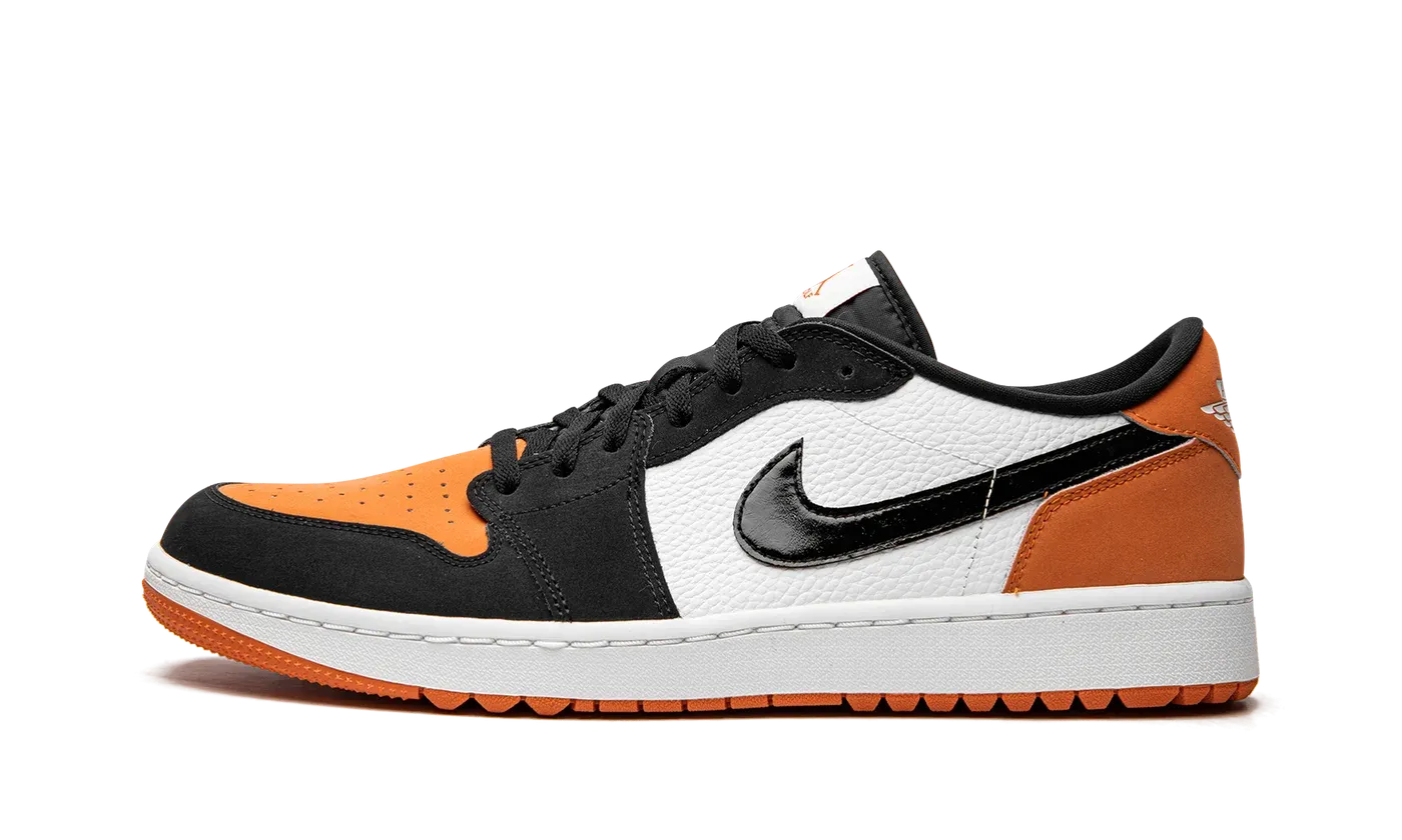 The Air Jordan 1 Low Golf "Shattered Backboard" is a modified version of the retro basketball shoe designed for golf in a popular Jordan 1 colorway. The "Shattered Backboard" theme was introduced into the Air Jordan collection in 2015, and is an homage to the overseas exhibition game that Michael Jordan participated in after his rookie season in the NBA. During the game, Jordan famously broke and shattered a glass backboard following a thunderous slam dunk. Here, the "Shattered Backboard" color story appears on the Jordan 1 Low Golf for the first time. The design features Starfish-colored leather on the perforated toe and on the heel. The mid-panel is designed in white leather. The toe cap, forefoot, and eyelets appear in black synthetic nubuck. A glossy black leather Swoosh is found on either side of the shoe while a white "Wings" logo resides on the heel. A Starfish Swoosh with "Air" branding appears on the tongue tag. Small nubs on the outsole provide traction on a golf course. Release date: June 1, 2022