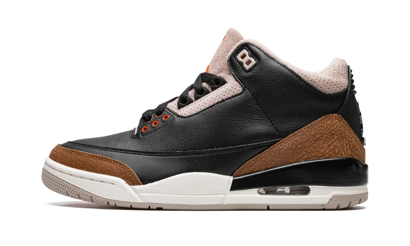 The Air Jordan 3 "Desert Elephant" remixes an original colorway of the heralded basketball sneaker. An April 2022 release by Jordan Brand, the "Desert Elephant" nods to the Jordan 3's original, iconic "Black Cement" colorway, as it features the same color block as the original version with a few modifications. The "Desert Elephant" is complete with a black tumbled leather upper, red lower eyelets, elephant print, and black laces, just like the "Black Cement." However, the "Desert Cement" replaces all grey elements with sandy beige accenting that gives the shoe a decidedly retro flair. Specifically, the eyelets, leather tongue, collar, inner lining, and the elephant print all appear in Desert Cement. Finishing touches include a white midsole with a visible Air bubble in the heel and a Desert Cement-colored rubber outsole. Release date: April 30, 2022